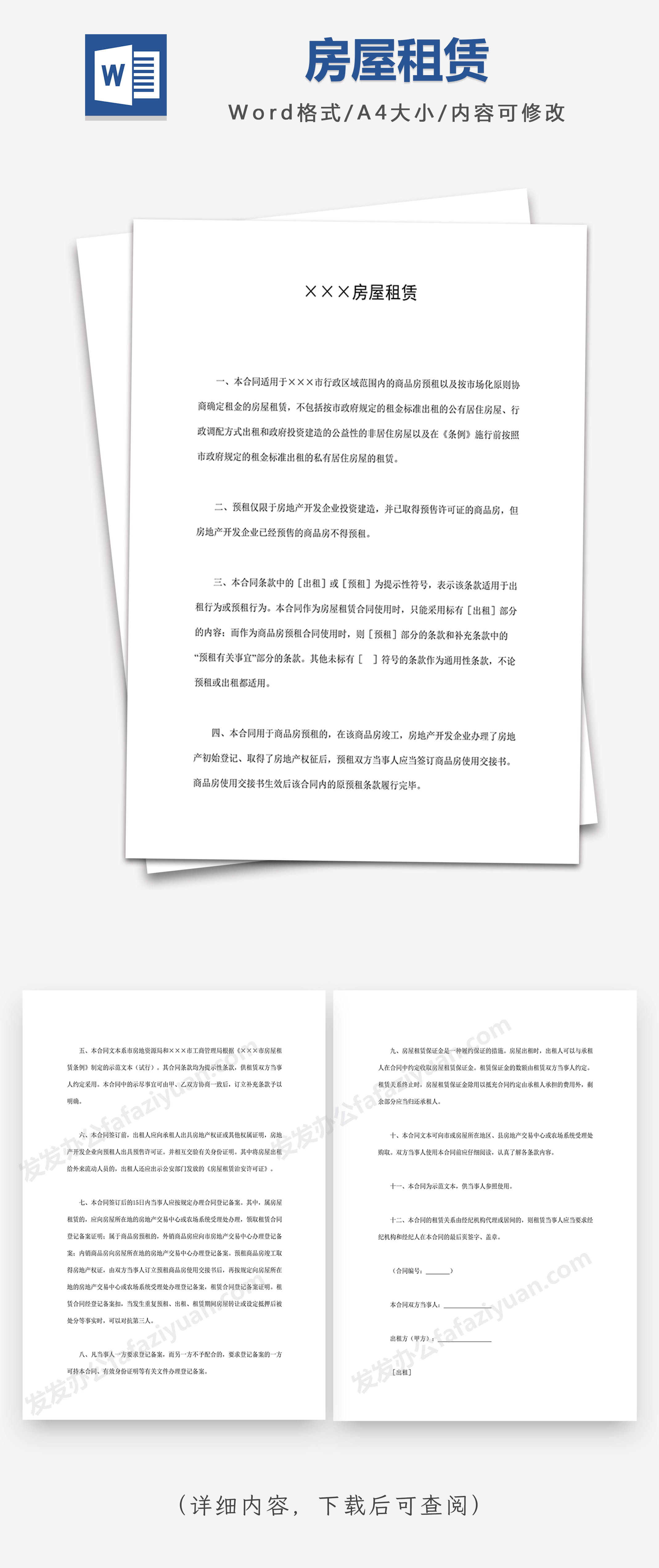 本作品内容为房屋租赁Word合同模板, 格式为 docx, 大小1 MB, 页数为15, 请使用软件Word打开, 作品中主体文字及图片可替换修改,文字修改可直接点击文本框进行编辑,图片更改可选中图片后单击鼠标右键选择更换图片,也可根据自身需求增加和删除作品中的内容, 源文件无水印, 欢迎使用发发资源库。