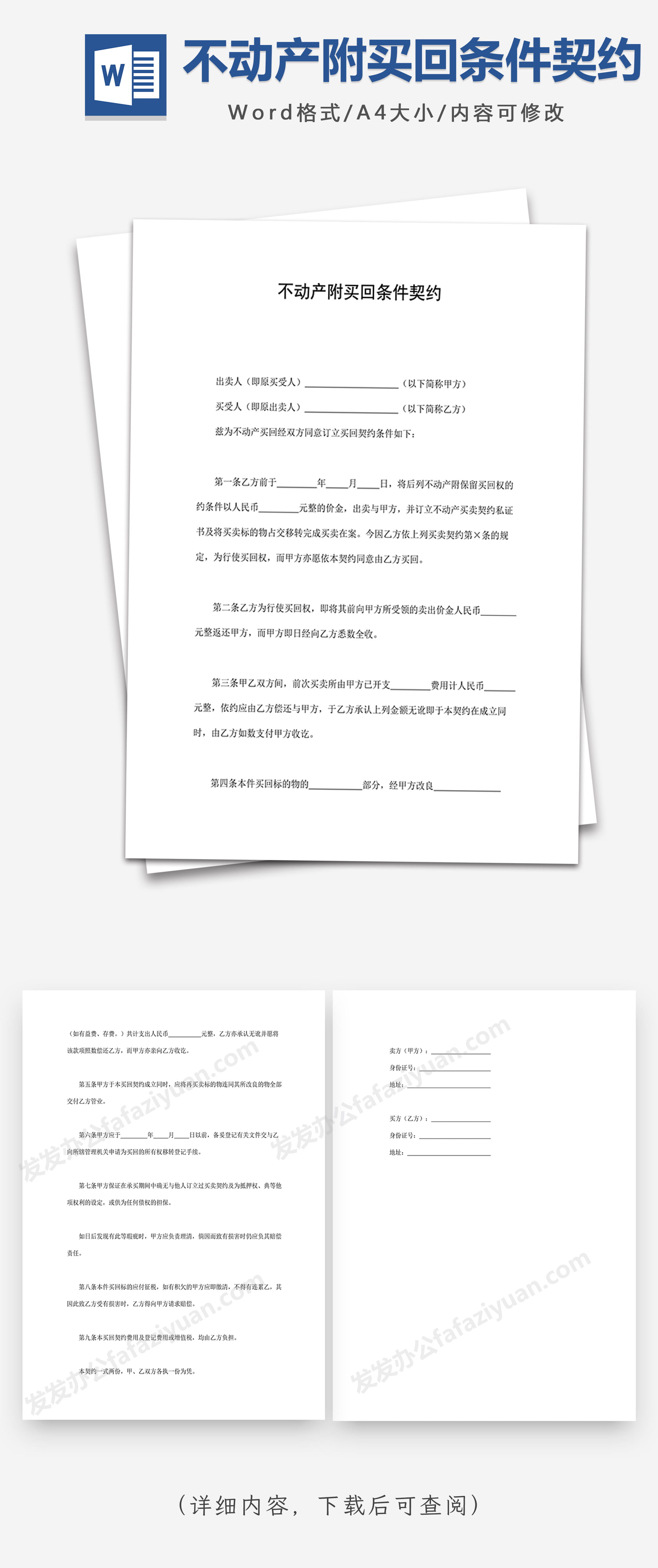 本作品内容为不动产附买回条件契约Word合同模板, 格式为 docx, 大小1 MB, 页数为3, 请使用软件Word打开, 作品中主体文字及图片可替换修改,文字修改可直接点击文本框进行编辑,图片更改可选中图片后单击鼠标右键选择更换图片,也可根据自身需求增加和删除作品中的内容, 源文件无水印, 欢迎使用发发资源库。