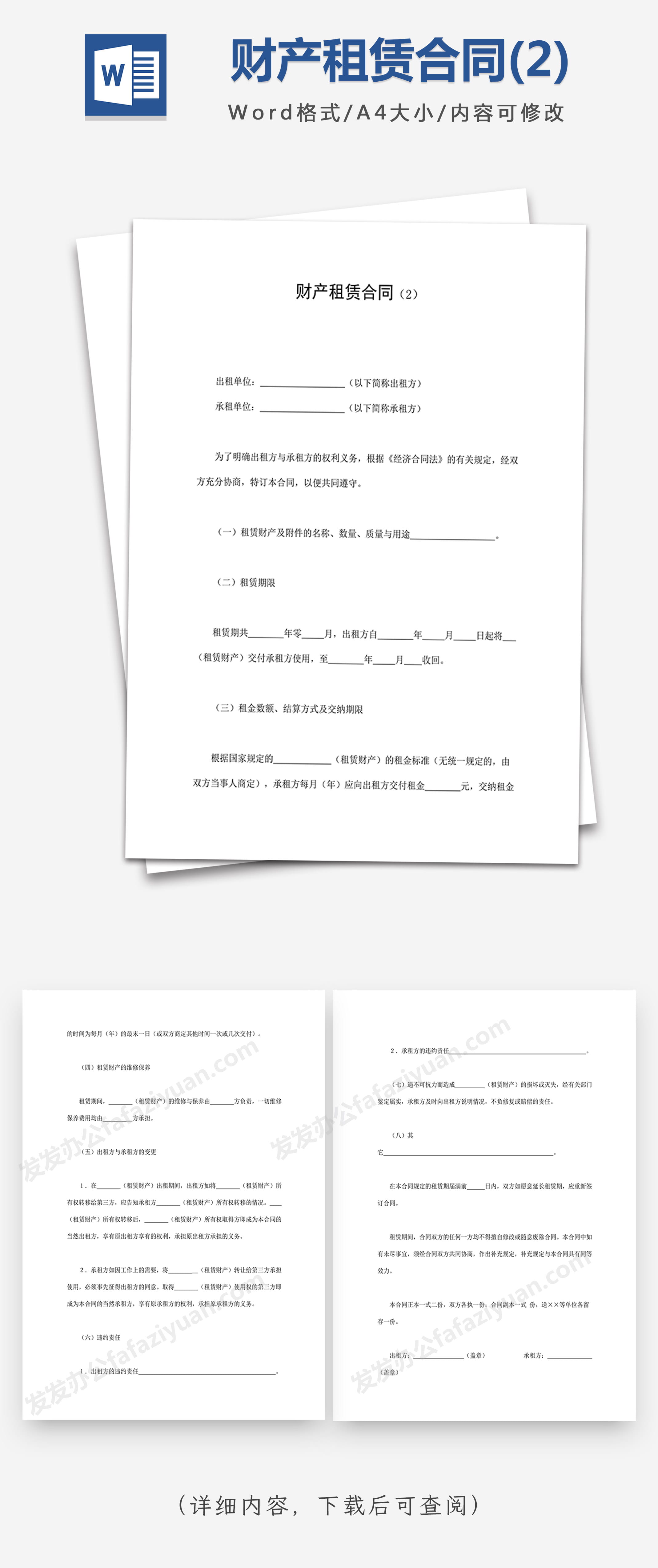 本作品内容为财产租赁合同(2)Word合同模板, 格式为 docx, 大小1 MB, 页数为4, 请使用软件Word打开, 作品中主体文字及图片可替换修改,文字修改可直接点击文本框进行编辑,图片更改可选中图片后单击鼠标右键选择更换图片,也可根据自身需求增加和删除作品中的内容, 源文件无水印, 欢迎使用发发资源库。 资源下载此资源下载价格为8.8F币,VIP免费,请先登录