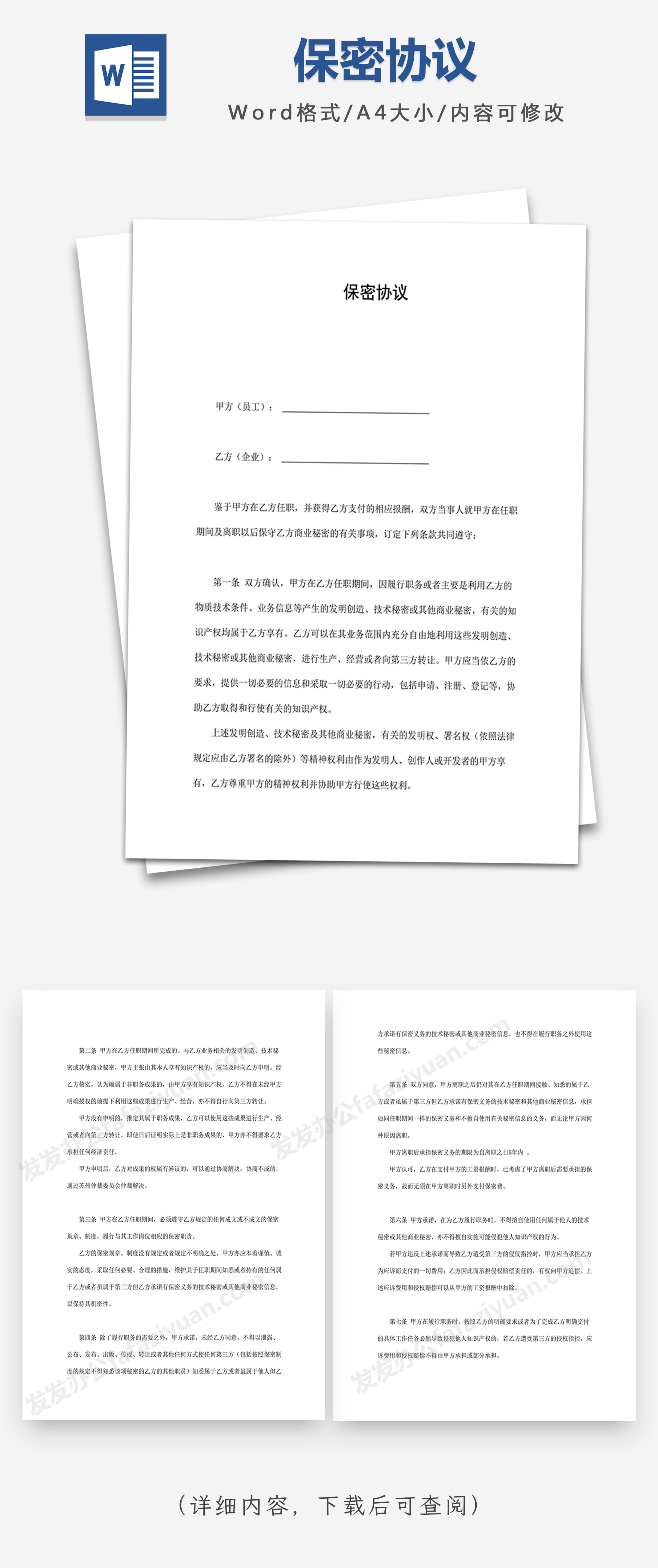 本作品内容为保密协议Word合同模板, 格式为 docx, 大小1 MB, 页数为6, 请使用软件Word打开, 作品中主体文字及图片可替换修改,文字修改可直接点击文本框进行编辑,图片更改可选中图片后单击鼠标右键选择更换图片,也可根据自身需求增加和删除作品中的内容, 源文件无水印, 欢迎使用发发资源库。