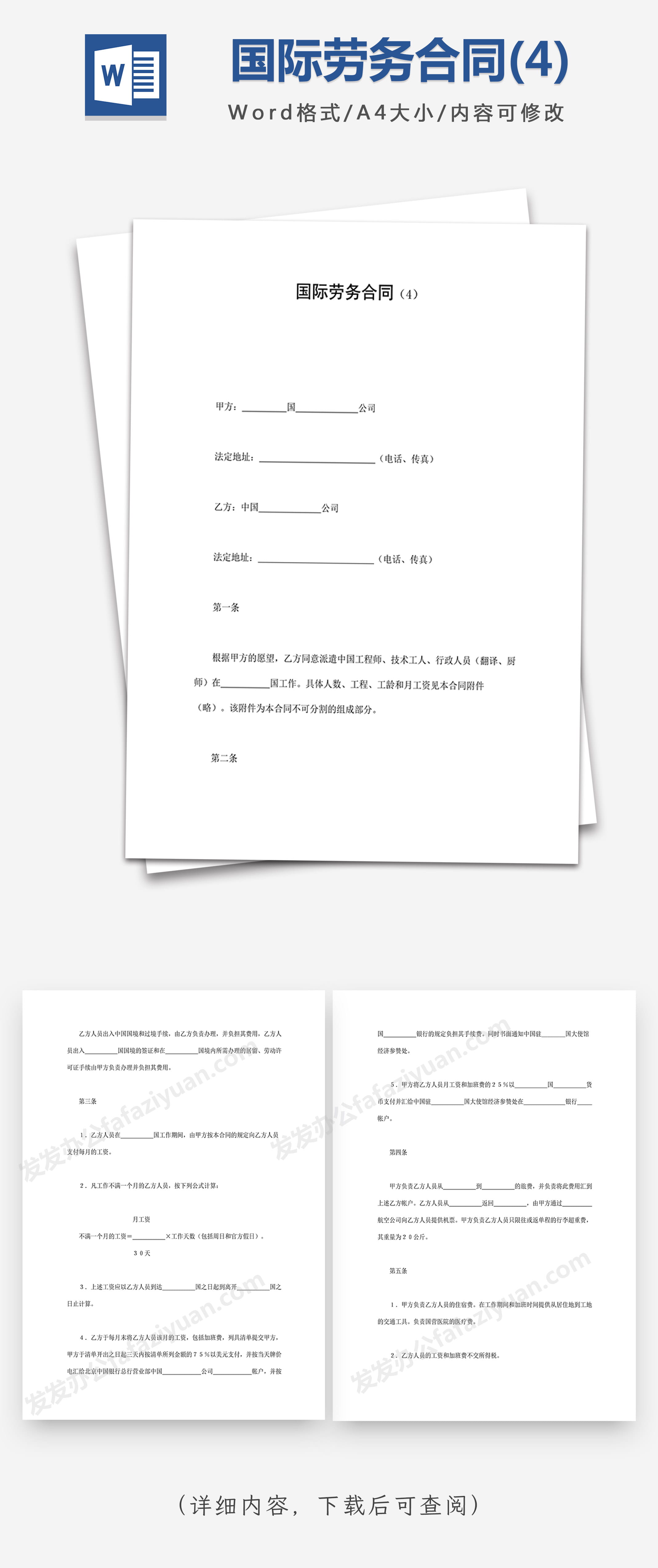 本作品内容为国际劳务合同(4)Word合同模板, 格式为 docx, 大小1 MB, 页数为12, 请使用软件Word打开, 作品中主体文字及图片可替换修改,文字修改可直接点击文本框进行编辑,图片更改可选中图片后单击鼠标右键选择更换图片,也可根据自身需求增加和删除作品中的内容, 源文件无水印, 欢迎使用发发资源库。 资源下载此资源下载价格为8.8F币,VIP免费,请先登录