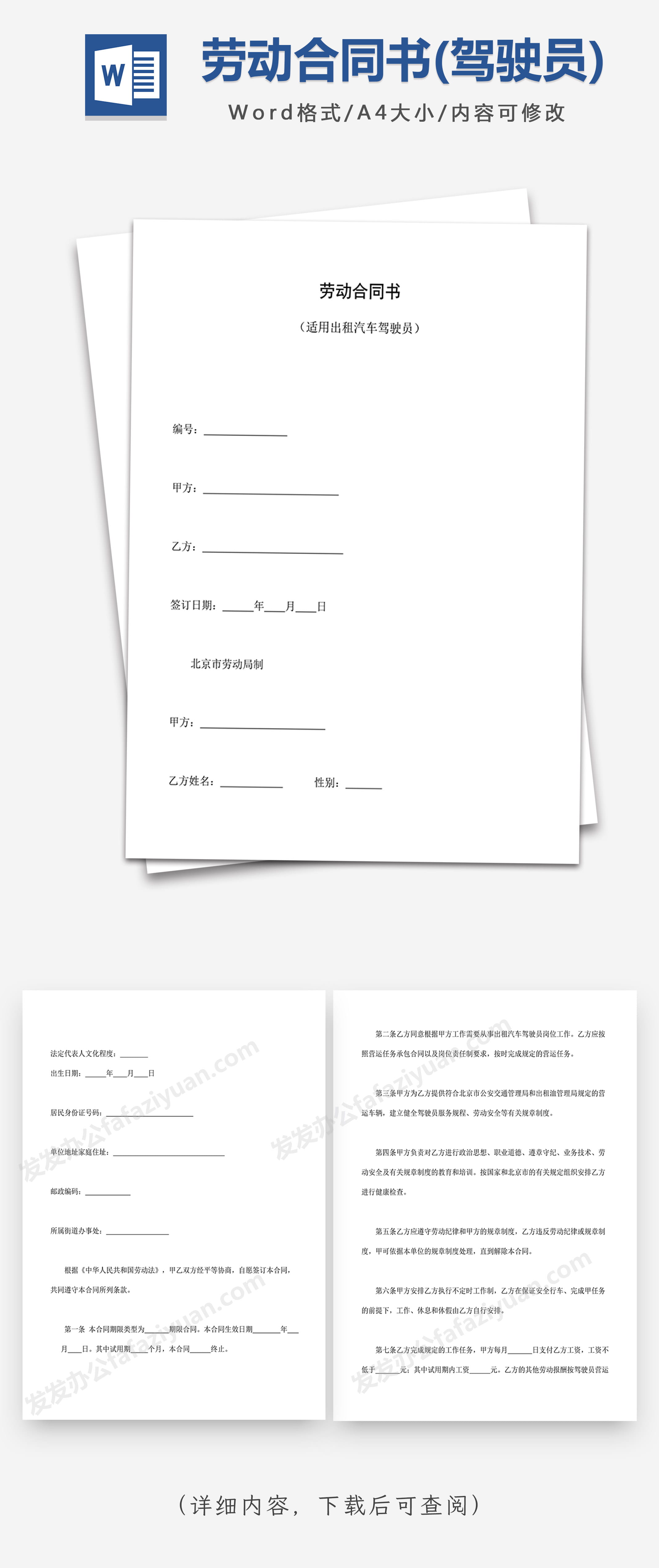 本作品内容为劳动合同书(适用出租汽车驾驶员)Word合同模板, 格式为 docx, 大小1 MB, 页数为11, 请使用软件Word打开, 作品中主体文字及图片可替换修改,文字修改可直接点击文本框进行编辑,图片更改可选中图片后单击鼠标右键选择更换图片,也可根据自身需求增加和删除作品中的内容, 源文件无水印, 欢迎使用发发资源库。