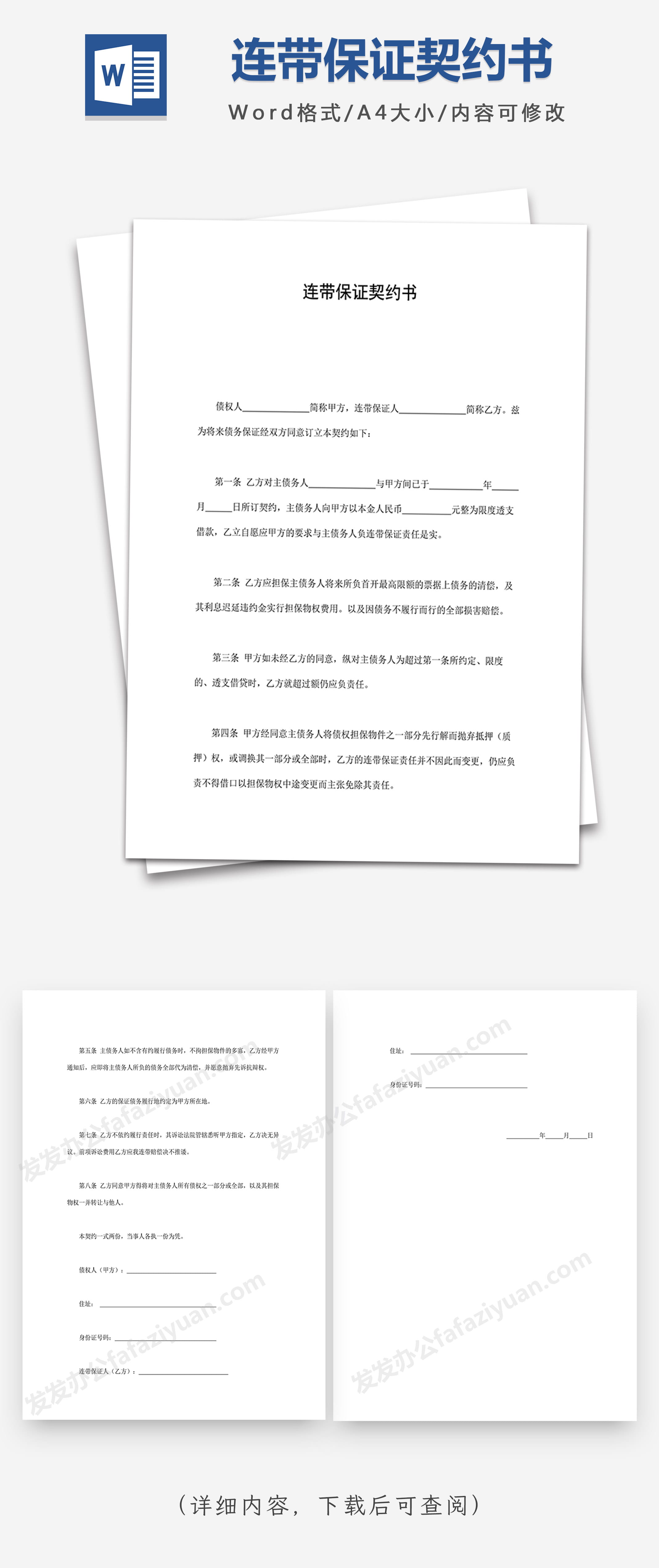本作品内容为连带保证契约书Word合同模板, 格式为 docx, 大小1 MB, 页数为3, 请使用软件Word打开, 作品中主体文字及图片可替换修改,文字修改可直接点击文本框进行编辑,图片更改可选中图片后单击鼠标右键选择更换图片,也可根据自身需求增加和删除作品中的内容, 源文件无水印, 欢迎使用发发资源库。