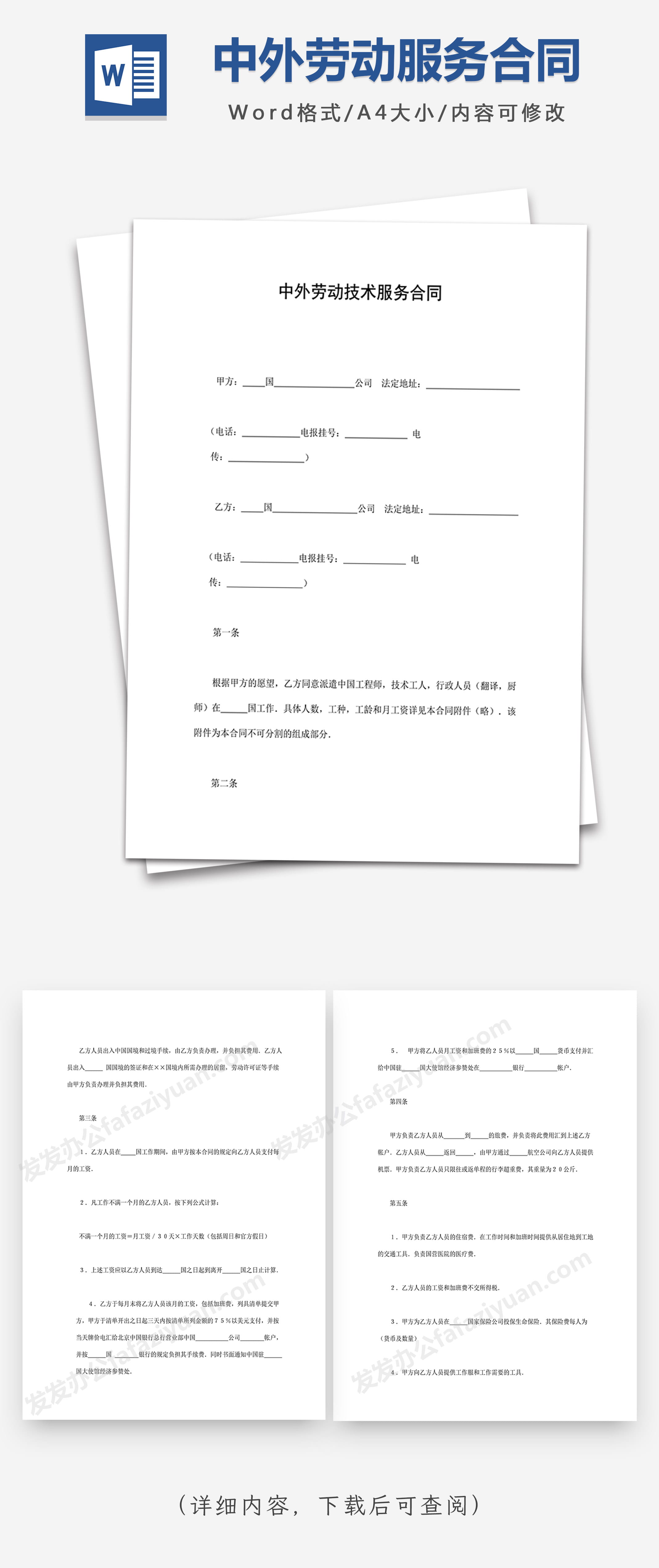 本作品内容为中外劳动技术服务合同, 格式为 docx, 大小1 MB, 页数为12, 请使用软件Word打开, 作品中主体文字及图片可替换修改,文字修改可直接点击文本框进行编辑,图片更改可选中图片后单击鼠标右键选择更换图片,也可根据自身需求增加和删除作品中的内容, 源文件无水印, 欢迎使用发发资源库。