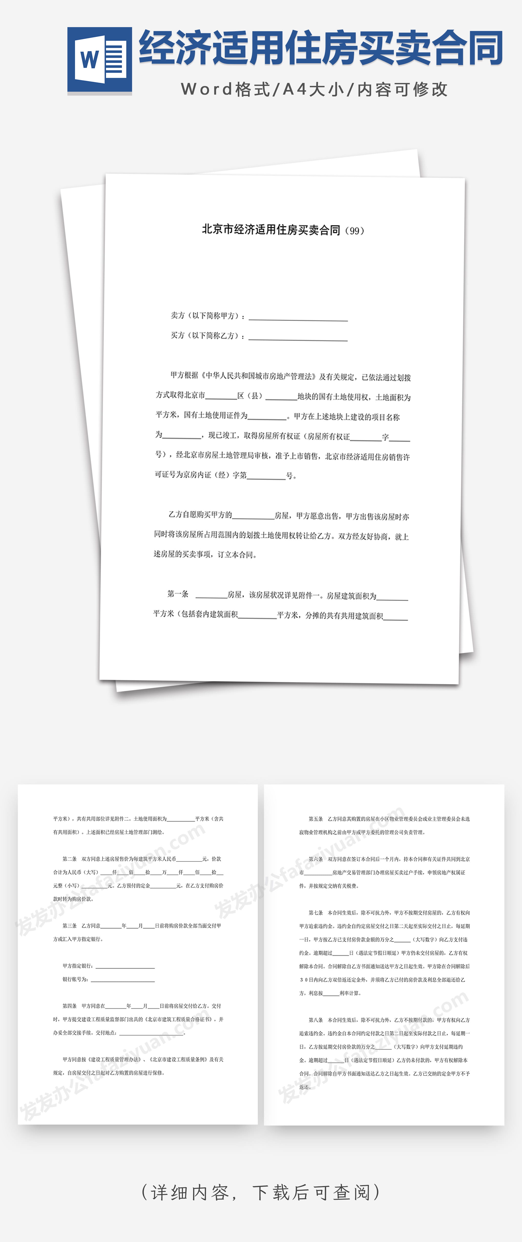 本作品内容为经济适用住房买卖合同, 格式为 docx, 大小1 MB, 页数为5, 请使用软件Word打开, 作品中主体文字及图片可替换修改,文字修改可直接点击文本框进行编辑,图片更改可选中图片后单击鼠标右键选择更换图片,也可根据自身需求增加和删除作品中的内容, 源文件无水印, 欢迎使用发发资源库。