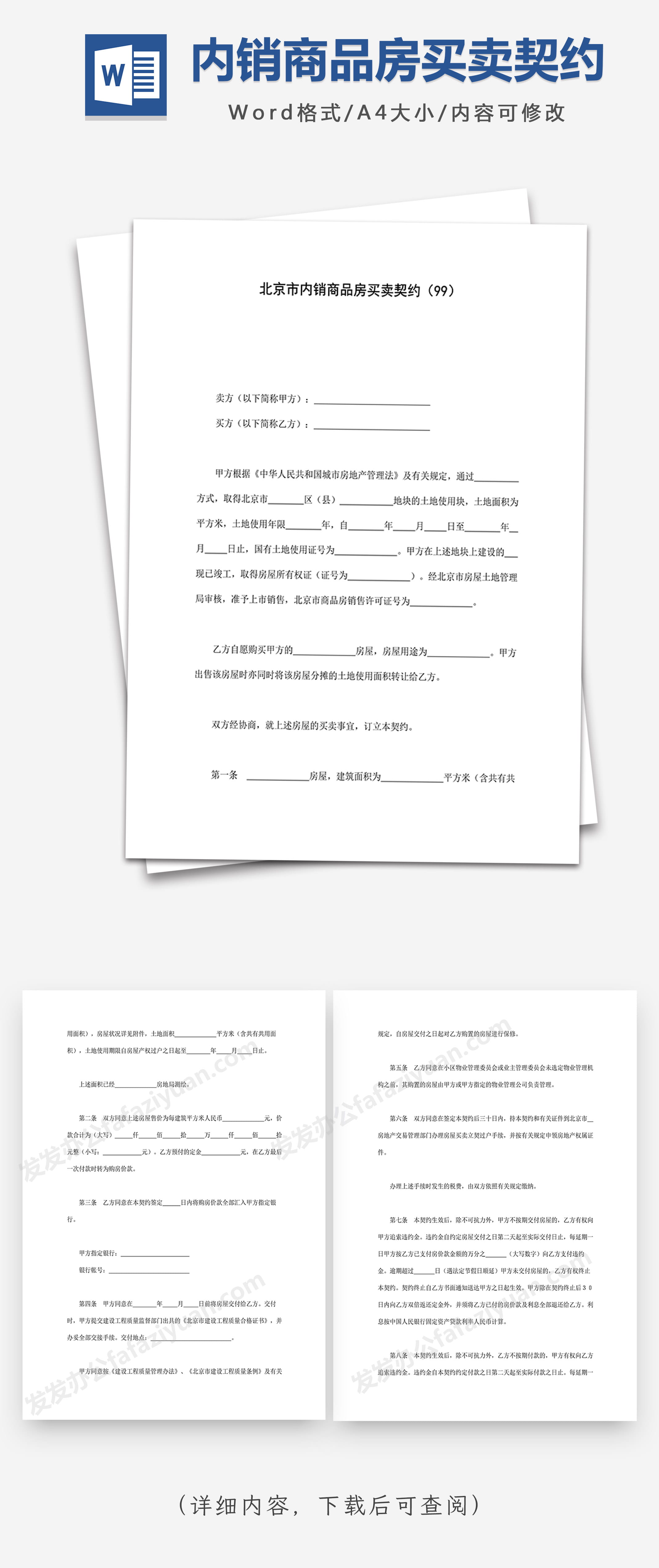 本作品内容为内销商品房买卖契约Word合同模板, 格式为 docx, 大小1 MB, 页数为5, 请使用软件Word打开, 作品中主体文字及图片可替换修改,文字修改可直接点击文本框进行编辑,图片更改可选中图片后单击鼠标右键选择更换图片,也可根据自身需求增加和删除作品中的内容, 源文件无水印, 欢迎使用发发资源库。 资源下载此资源下载价格为8.8F币,VIP免费,请先登录