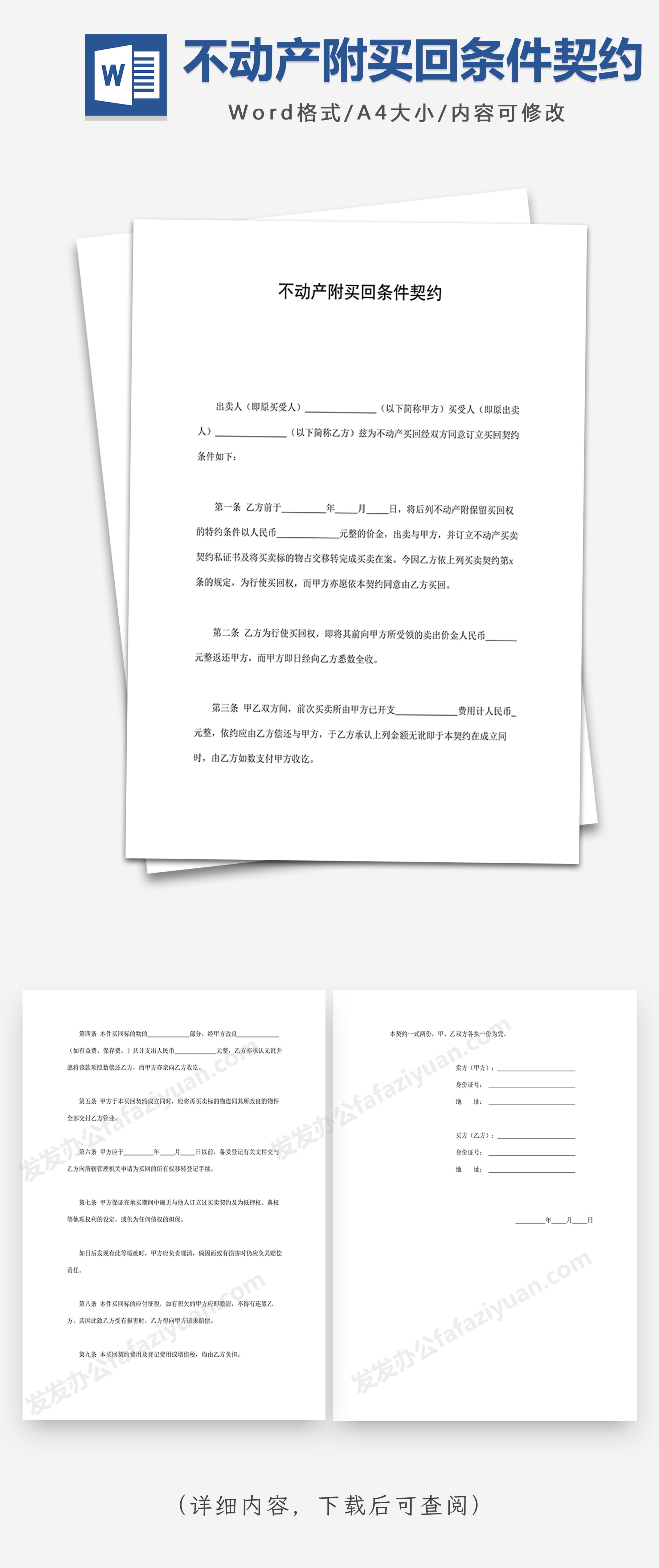 本作品内容为不动产附买回条件契约Word合同模板, 格式为 docx, 大小1 MB, 页数为3, 请使用软件Word打开, 作品中主体文字及图片可替换修改,文字修改可直接点击文本框进行编辑,图片更改可选中图片后单击鼠标右键选择更换图片,也可根据自身需求增加和删除作品中的内容, 源文件无水印, 欢迎使用发发资源库。