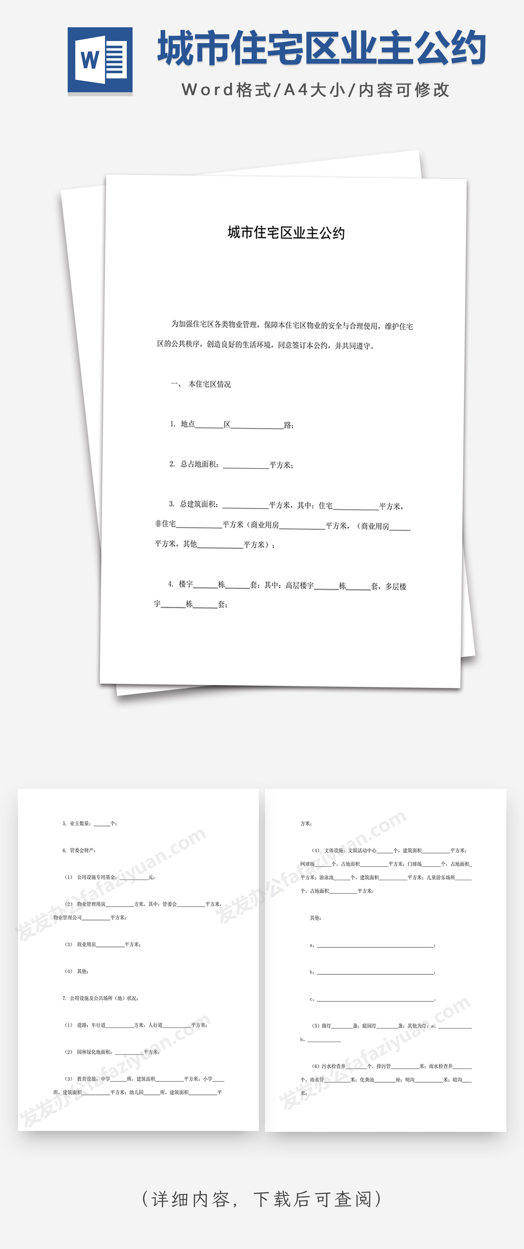 本作品内容为城市住宅区业主公约, 格式为 docx, 大小1 MB, 页数为18, 请使用软件Word打开, 作品中主体文字及图片可替换修改,文字修改可直接点击文本框进行编辑,图片更改可选中图片后单击鼠标右键选择更换图片,也可根据自身需求增加和删除作品中的内容, 源文件无水印, 欢迎使用发发资源库。