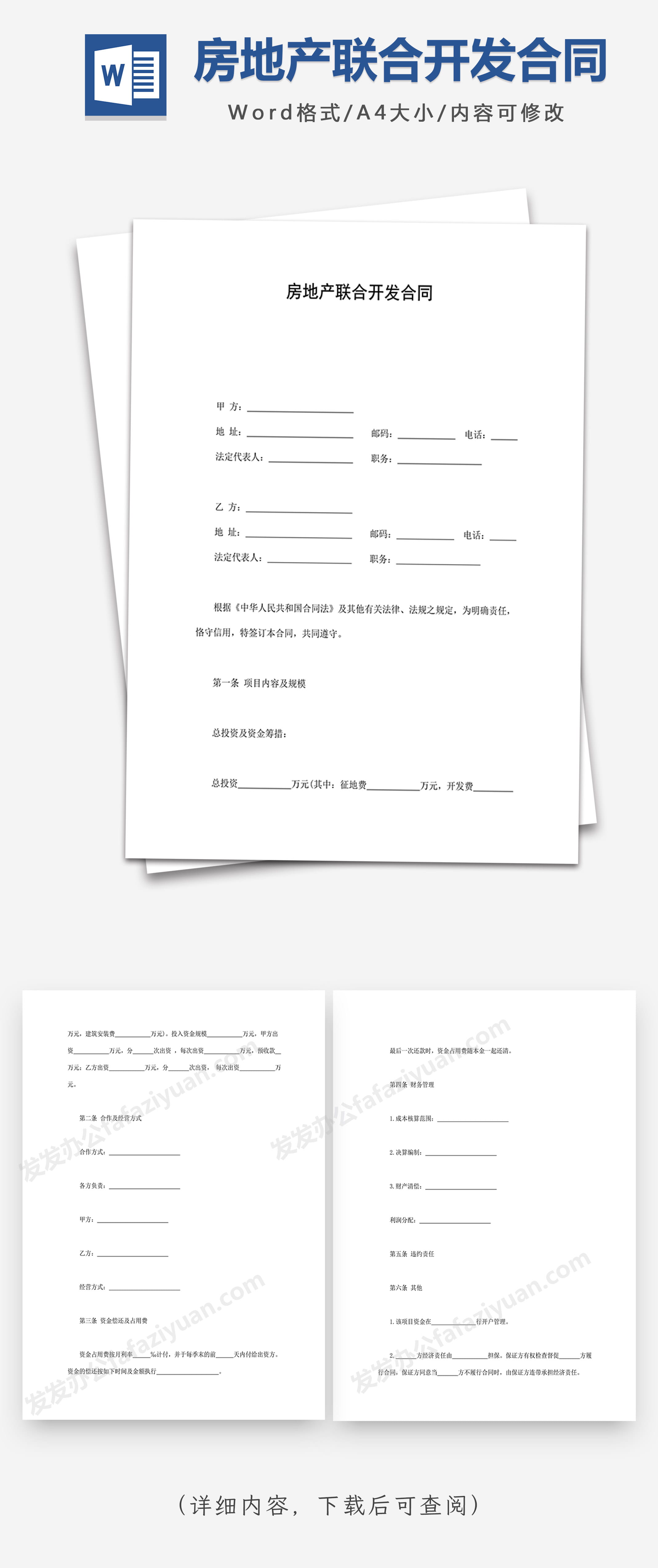 本作品内容为房地产联合开发合同Word合同模板, 格式为 docx, 大小1 MB, 页数为5, 请使用软件Word打开, 作品中主体文字及图片可替换修改,文字修改可直接点击文本框进行编辑,图片更改可选中图片后单击鼠标右键选择更换图片,也可根据自身需求增加和删除作品中的内容, 源文件无水印, 欢迎使用发发资源库。 资源下载此资源下载价格为8.8F币,VIP免费,请先登录