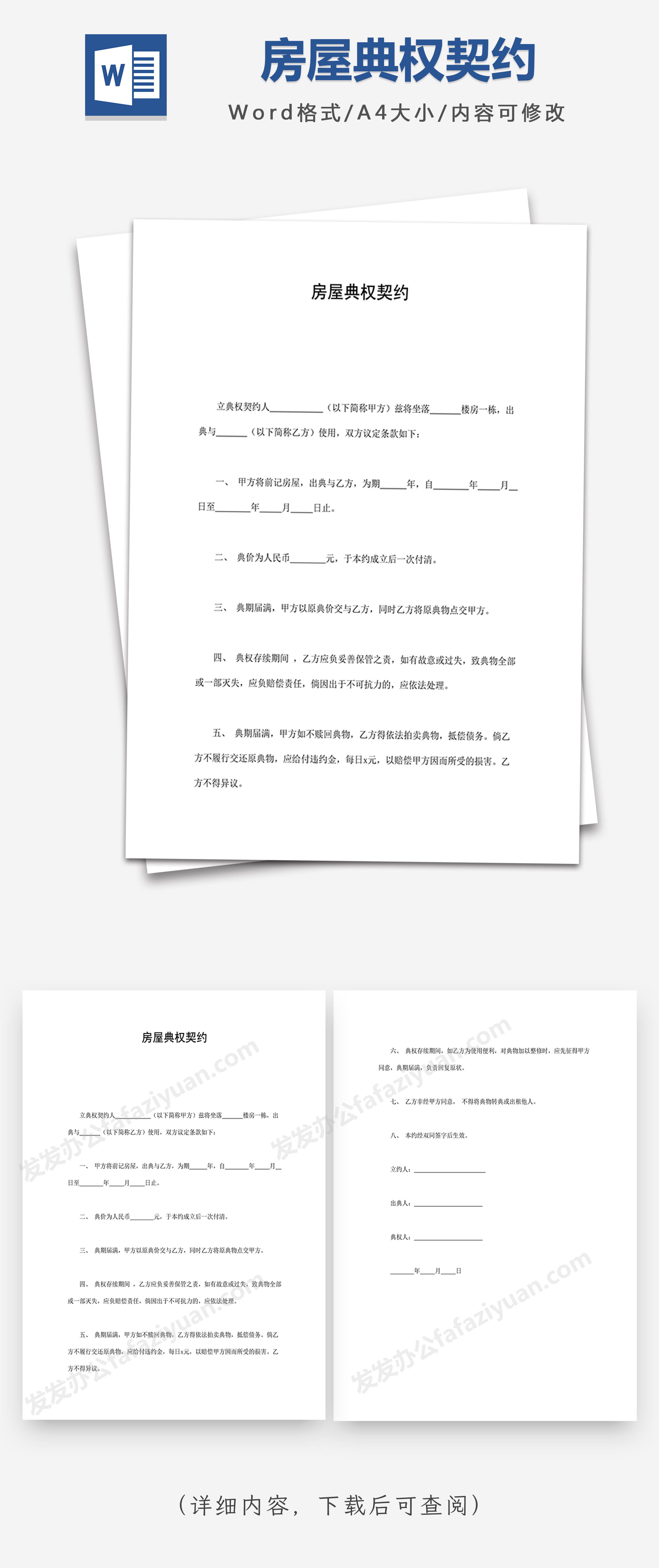 本作品内容为房屋典权契约Word合同模板, 格式为 docx, 大小1 MB, 页数为2, 请使用软件Word打开, 作品中主体文字及图片可替换修改,文字修改可直接点击文本框进行编辑,图片更改可选中图片后单击鼠标右键选择更换图片,也可根据自身需求增加和删除作品中的内容, 源文件无水印, 欢迎使用发发资源库。 资源下载此资源下载价格为8.8F币,VIP免费,请先登录