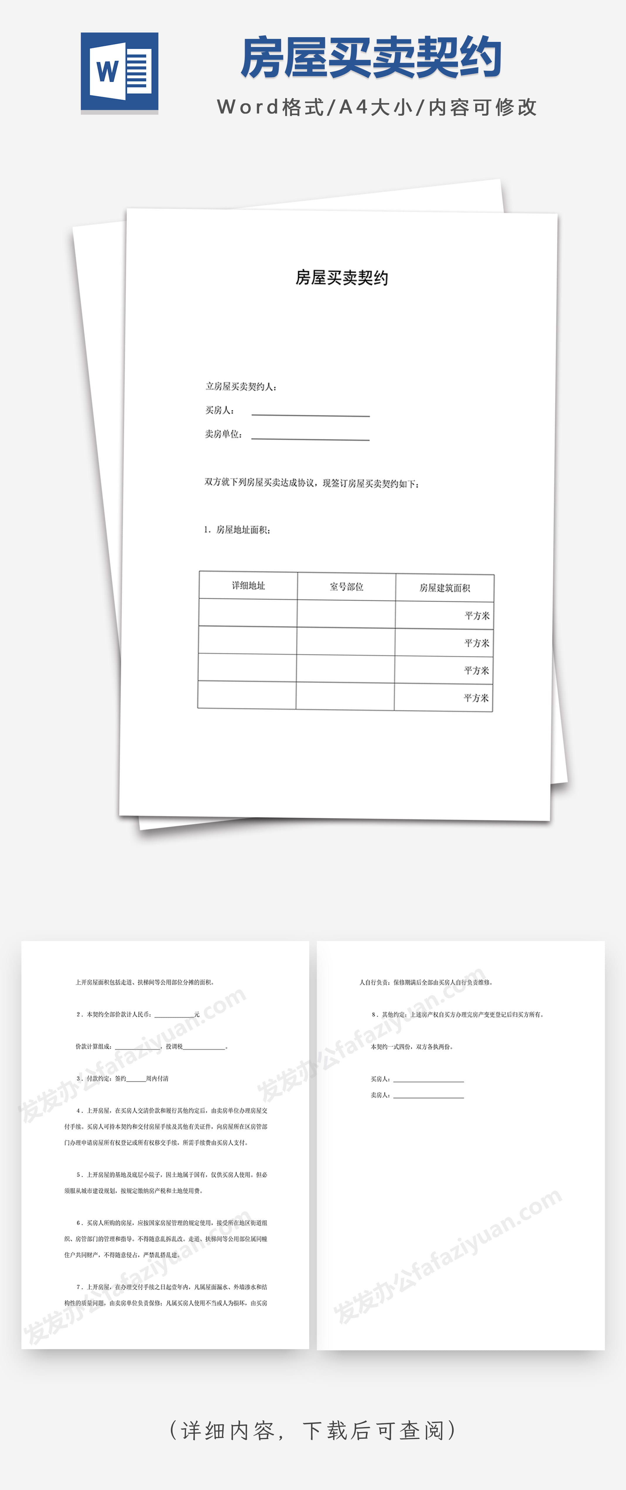 本作品内容为房屋买卖契约Word合同模板, 格式为 docx, 大小1 MB, 页数为3, 请使用软件Word打开, 作品中主体文字及图片可替换修改,文字修改可直接点击文本框进行编辑,图片更改可选中图片后单击鼠标右键选择更换图片,也可根据自身需求增加和删除作品中的内容, 源文件无水印, 欢迎使用发发资源库。