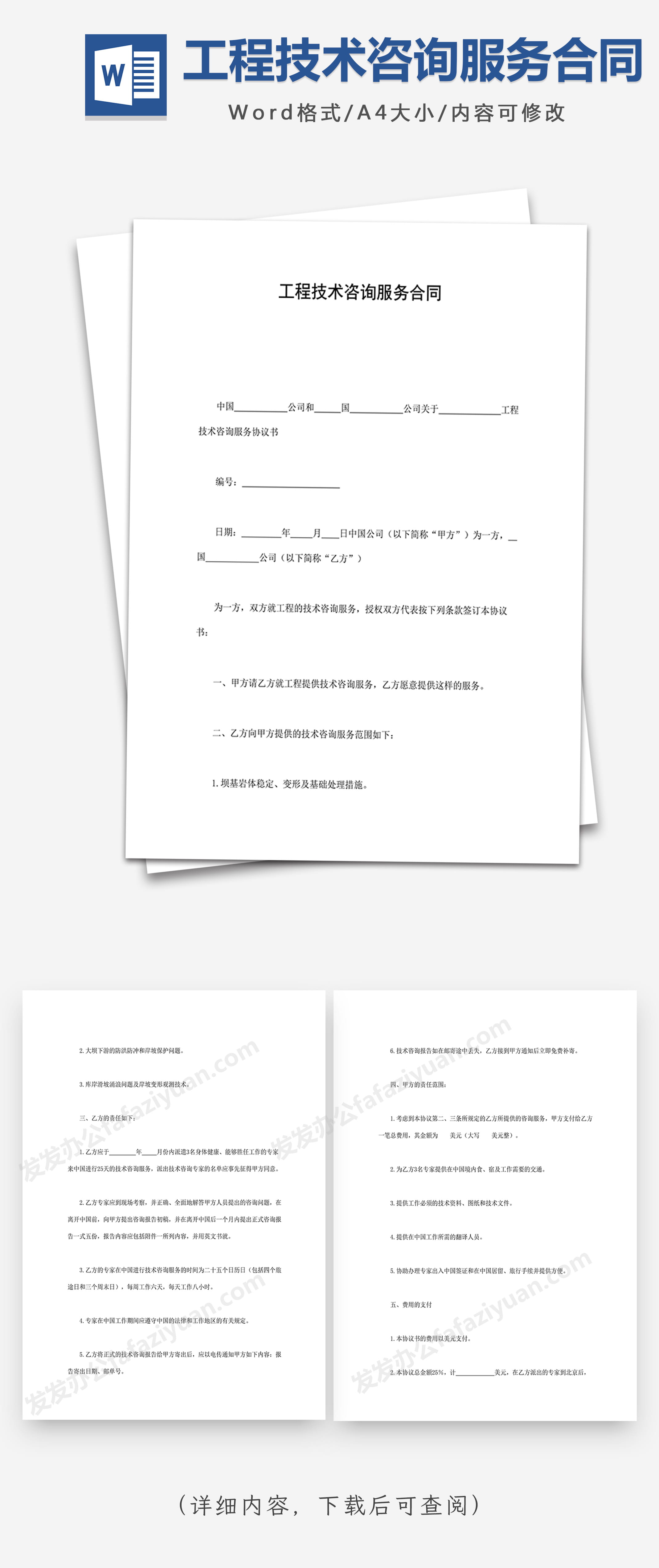 本作品内容为工程技术咨询服务合同, 格式为 docx, 大小1 MB, 页数为7, 请使用软件Word打开, 作品中主体文字及图片可替换修改,文字修改可直接点击文本框进行编辑,图片更改可选中图片后单击鼠标右键选择更换图片,也可根据自身需求增加和删除作品中的内容, 源文件无水印, 欢迎使用发发资源库。