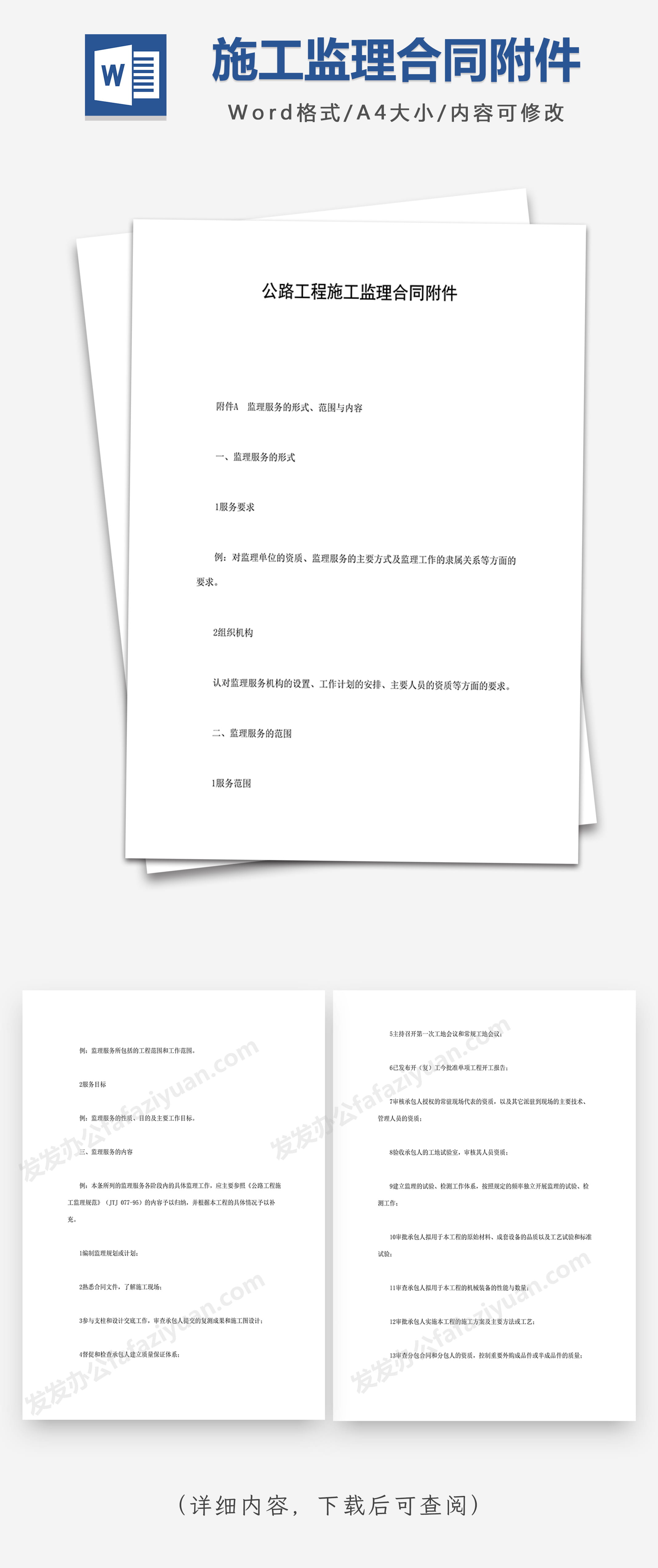 本作品内容为公路工程施工监理合同附件, 格式为 docx, 大小1 MB, 页数为17, 请使用软件Word打开, 作品中主体文字及图片可替换修改,文字修改可直接点击文本框进行编辑,图片更改可选中图片后单击鼠标右键选择更换图片,也可根据自身需求增加和删除作品中的内容, 源文件无水印, 欢迎使用发发资源库。 资源下载此资源下载价格为8.8F币,VIP免费,请先登录
