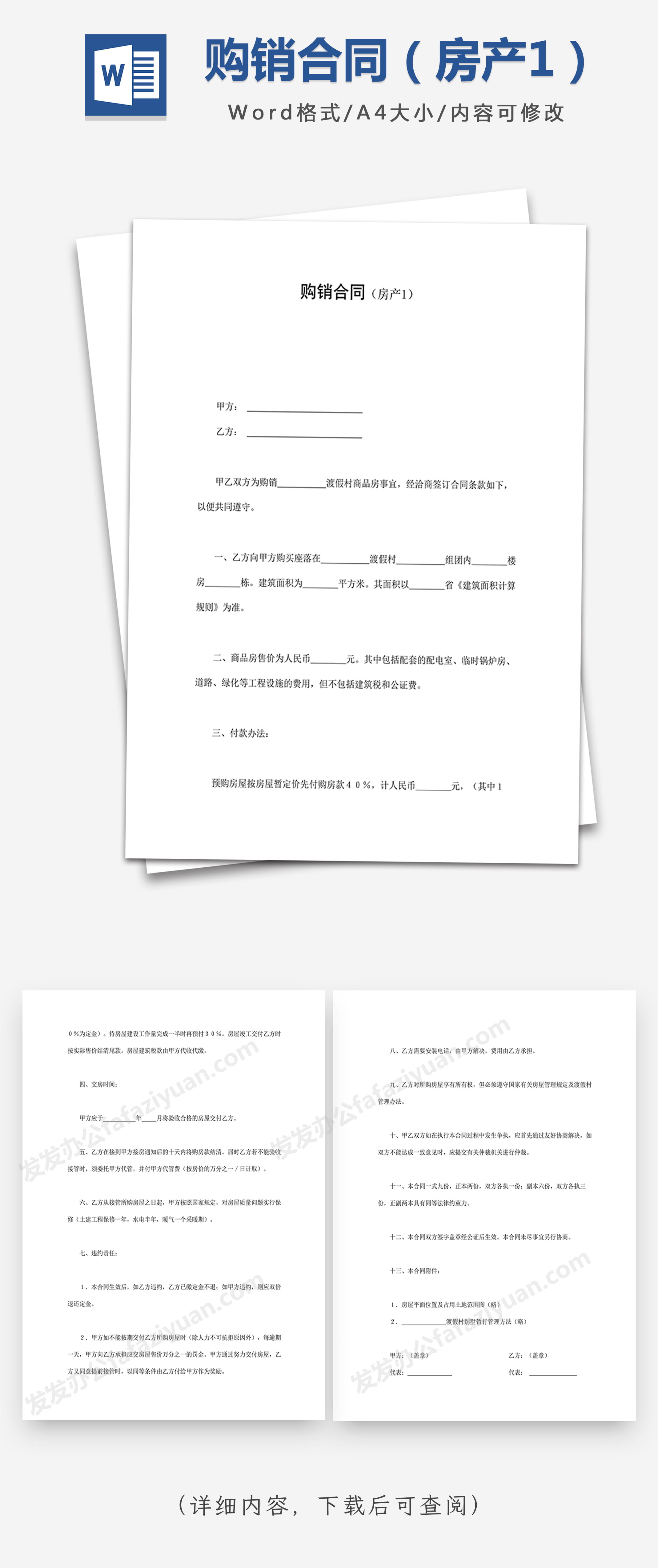 本作品内容为购销合同(房产1), 格式为 docx, 大小1 MB, 页数为4, 请使用软件Word打开, 作品中主体文字及图片可替换修改,文字修改可直接点击文本框进行编辑,图片更改可选中图片后单击鼠标右键选择更换图片,也可根据自身需求增加和删除作品中的内容, 源文件无水印, 欢迎使用发发资源库。 资源下载此资源下载价格为8.8F币,VIP免费,请先登录