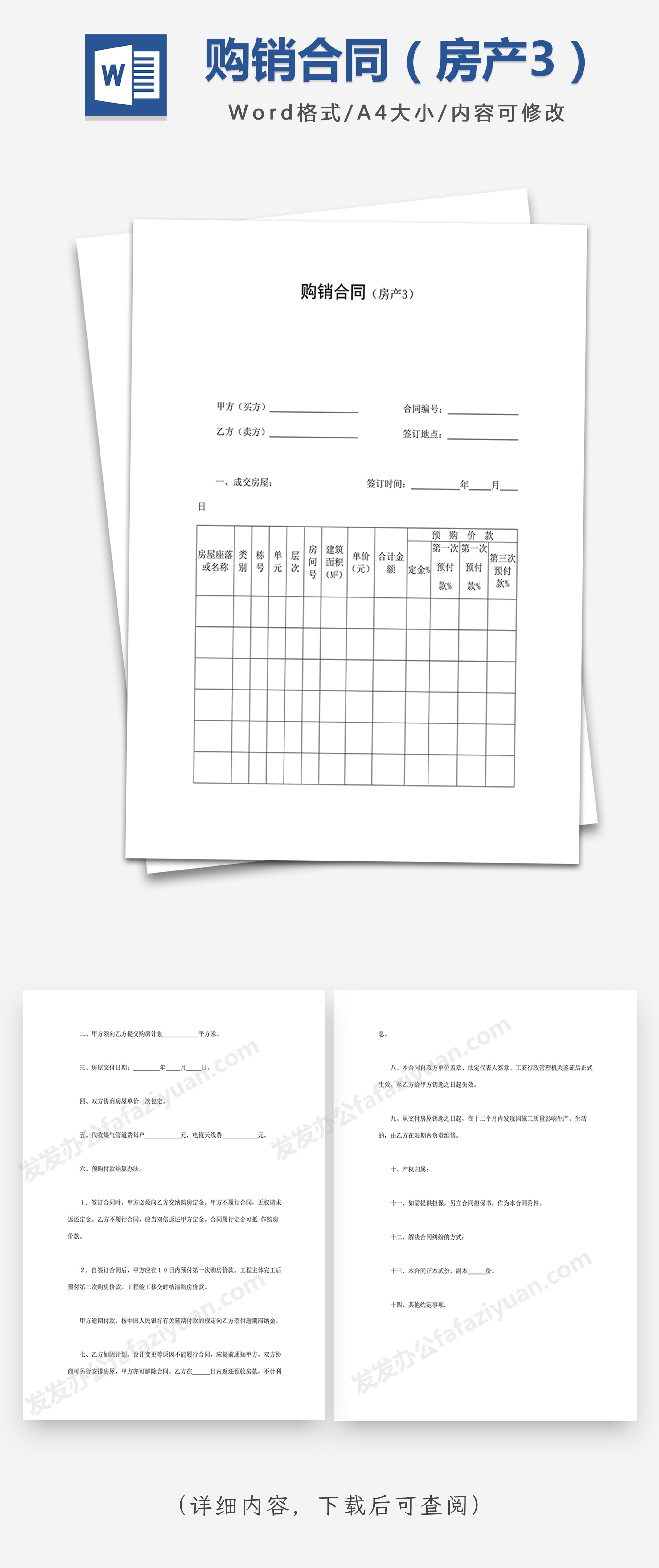 本作品内容为购销合同(房产3), 格式为 docx, 大小1 MB, 页数为4, 请使用软件Word打开, 作品中主体文字及图片可替换修改,文字修改可直接点击文本框进行编辑,图片更改可选中图片后单击鼠标右键选择更换图片,也可根据自身需求增加和删除作品中的内容, 源文件无水印, 欢迎使用发发资源库。