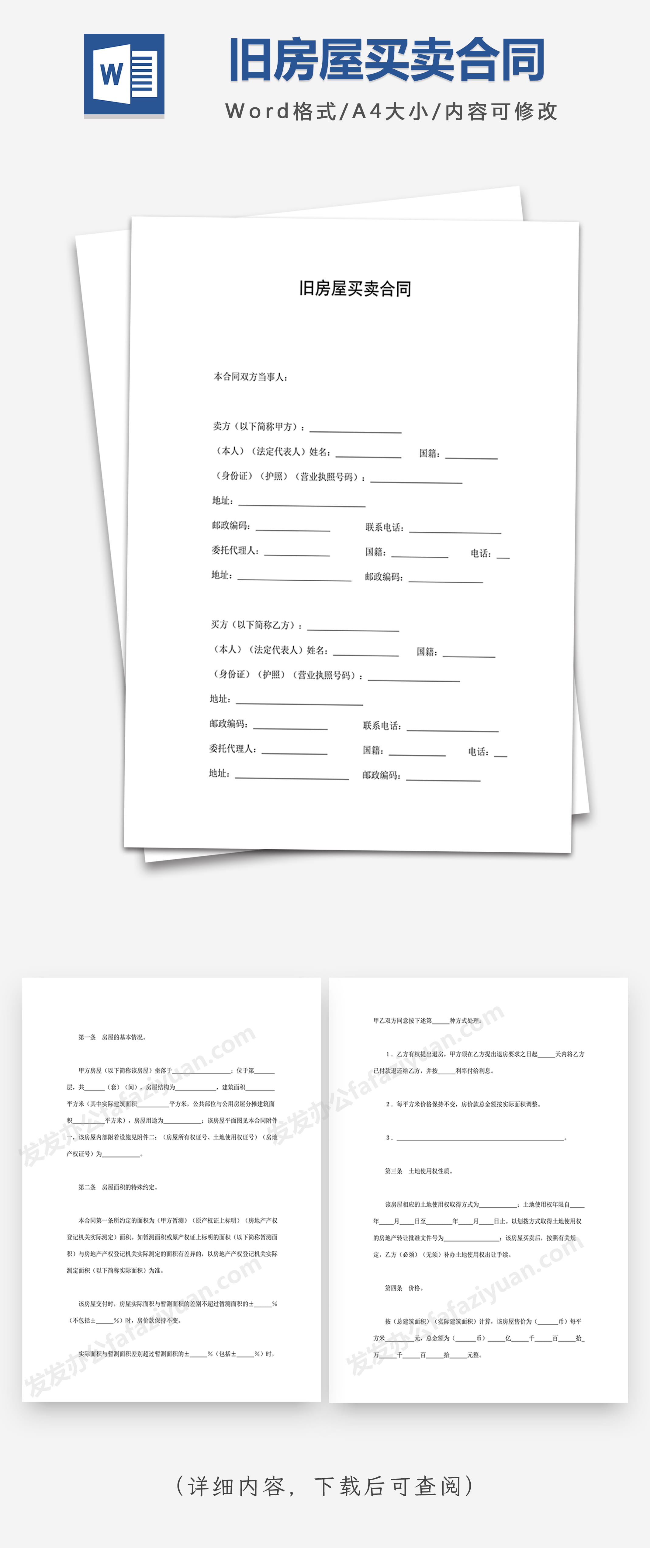 本作品内容为旧房屋买卖合同, 格式为 docx, 大小1 MB, 页数为8, 请使用软件Word打开, 作品中主体文字及图片可替换修改,文字修改可直接点击文本框进行编辑,图片更改可选中图片后单击鼠标右键选择更换图片,也可根据自身需求增加和删除作品中的内容, 源文件无水印, 欢迎使用发发资源库。