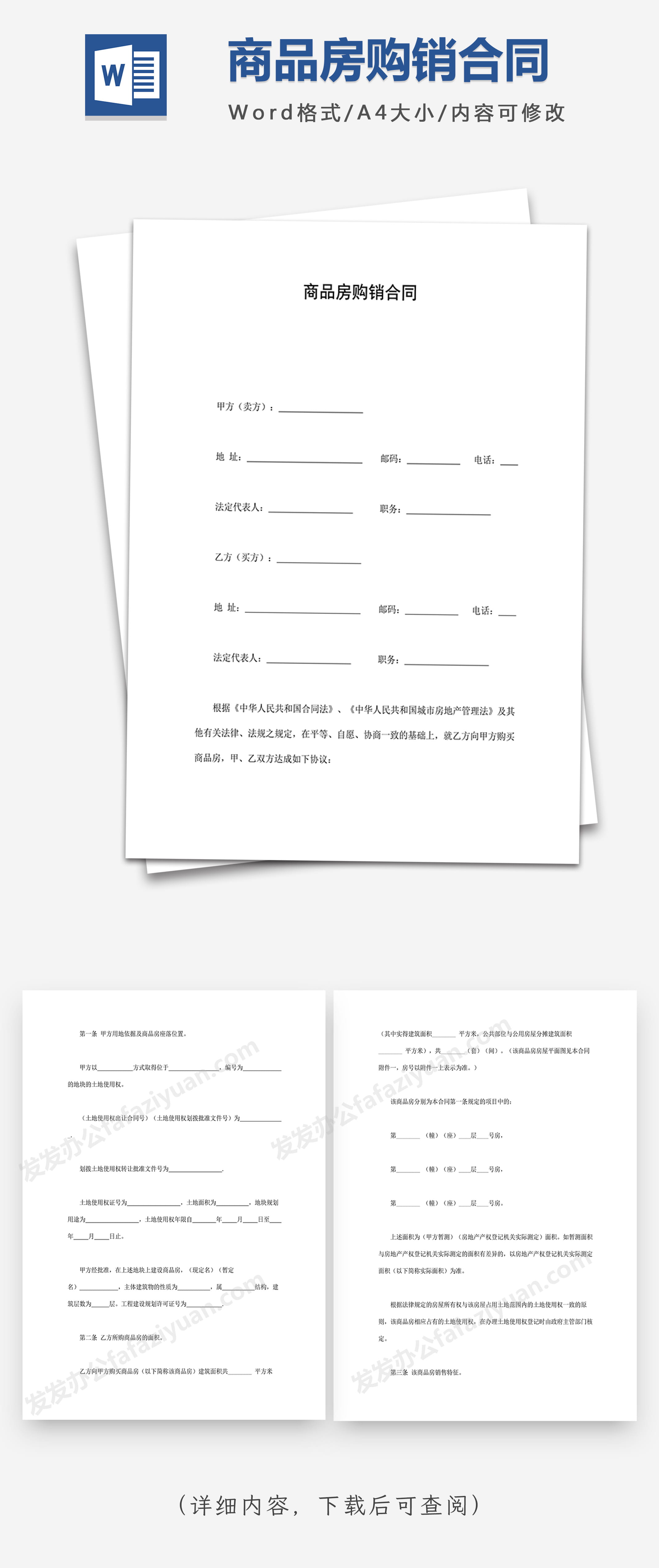 本作品内容为商品房购销合同, 格式为 docx, 大小1 MB, 页数为16, 请使用软件Word打开, 作品中主体文字及图片可替换修改,文字修改可直接点击文本框进行编辑,图片更改可选中图片后单击鼠标右键选择更换图片,也可根据自身需求增加和删除作品中的内容, 源文件无水印, 欢迎使用发发资源库。