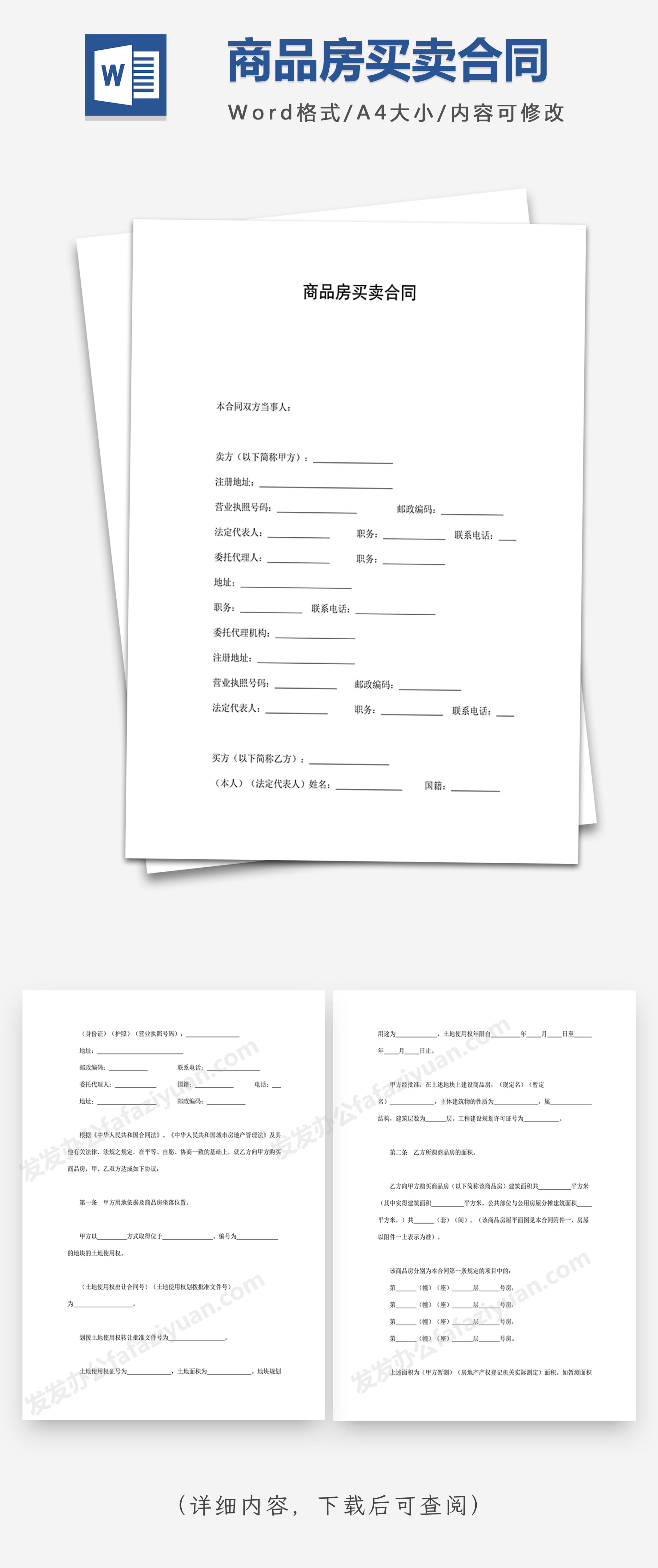 本作品内容为商品房买卖合同1Word合同模板, 格式为 docx, 大小1 MB, 页数为17, 请使用软件Word打开, 作品中主体文字及图片可替换修改,文字修改可直接点击文本框进行编辑,图片更改可选中图片后单击鼠标右键选择更换图片,也可根据自身需求增加和删除作品中的内容, 源文件无水印, 欢迎使用发发资源库。