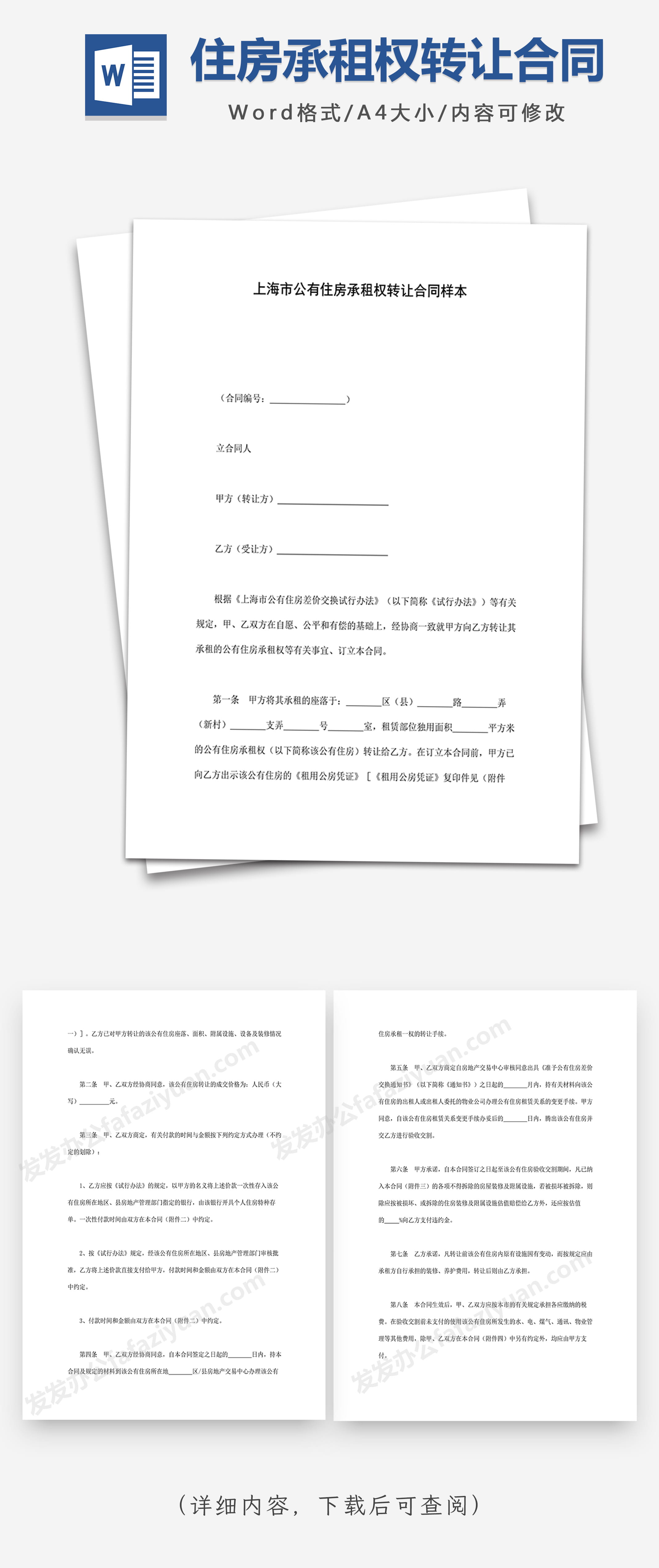 本作品内容为上海市公有住房承租权转让合同样本, 格式为 docx, 大小1 MB, 页数为11, 请使用软件Word打开, 作品中主体文字及图片可替换修改,文字修改可直接点击文本框进行编辑,图片更改可选中图片后单击鼠标右键选择更换图片,也可根据自身需求增加和删除作品中的内容, 源文件无水印, 欢迎使用发发资源库。 资源下载此资源下载价格为8.8F币,VIP免费,请先登录
