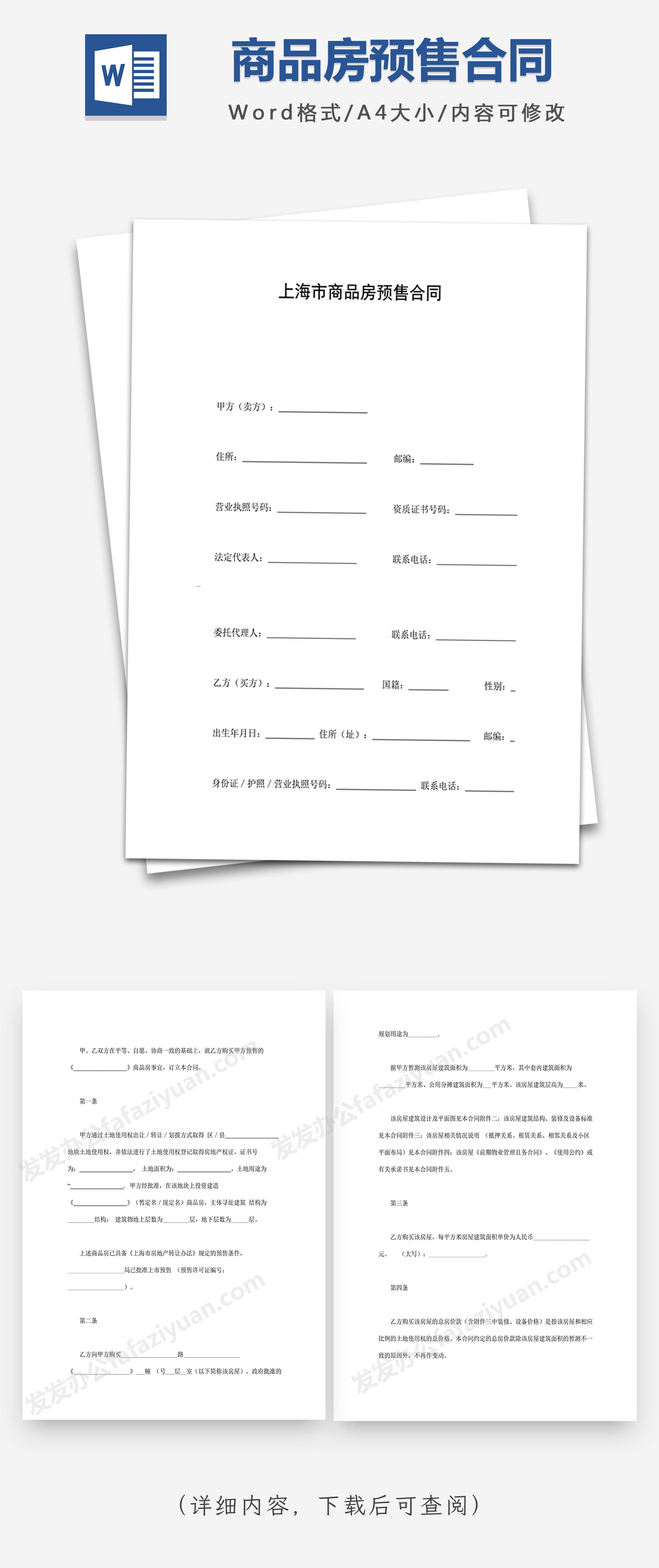 本作品内容为上海市商品房预售合同, 格式为 docx, 大小1 MB, 页数为15, 请使用软件Word打开, 作品中主体文字及图片可替换修改,文字修改可直接点击文本框进行编辑,图片更改可选中图片后单击鼠标右键选择更换图片,也可根据自身需求增加和删除作品中的内容, 源文件无水印, 欢迎使用发发资源库。
