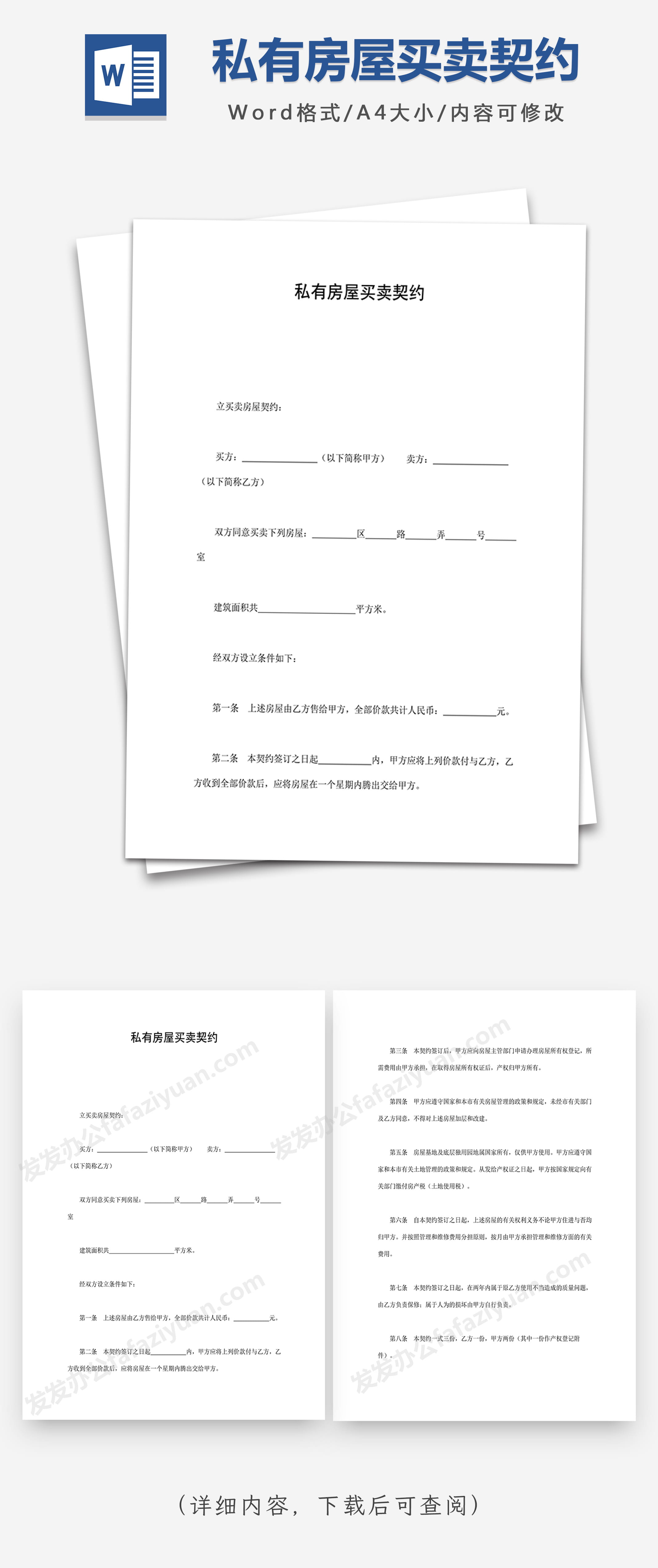 本作品内容为私有房屋买卖契约, 格式为 docx, 大小1 MB, 页数为2, 请使用软件Word打开, 作品中主体文字及图片可替换修改,文字修改可直接点击文本框进行编辑,图片更改可选中图片后单击鼠标右键选择更换图片,也可根据自身需求增加和删除作品中的内容, 源文件无水印, 欢迎使用发发资源库。