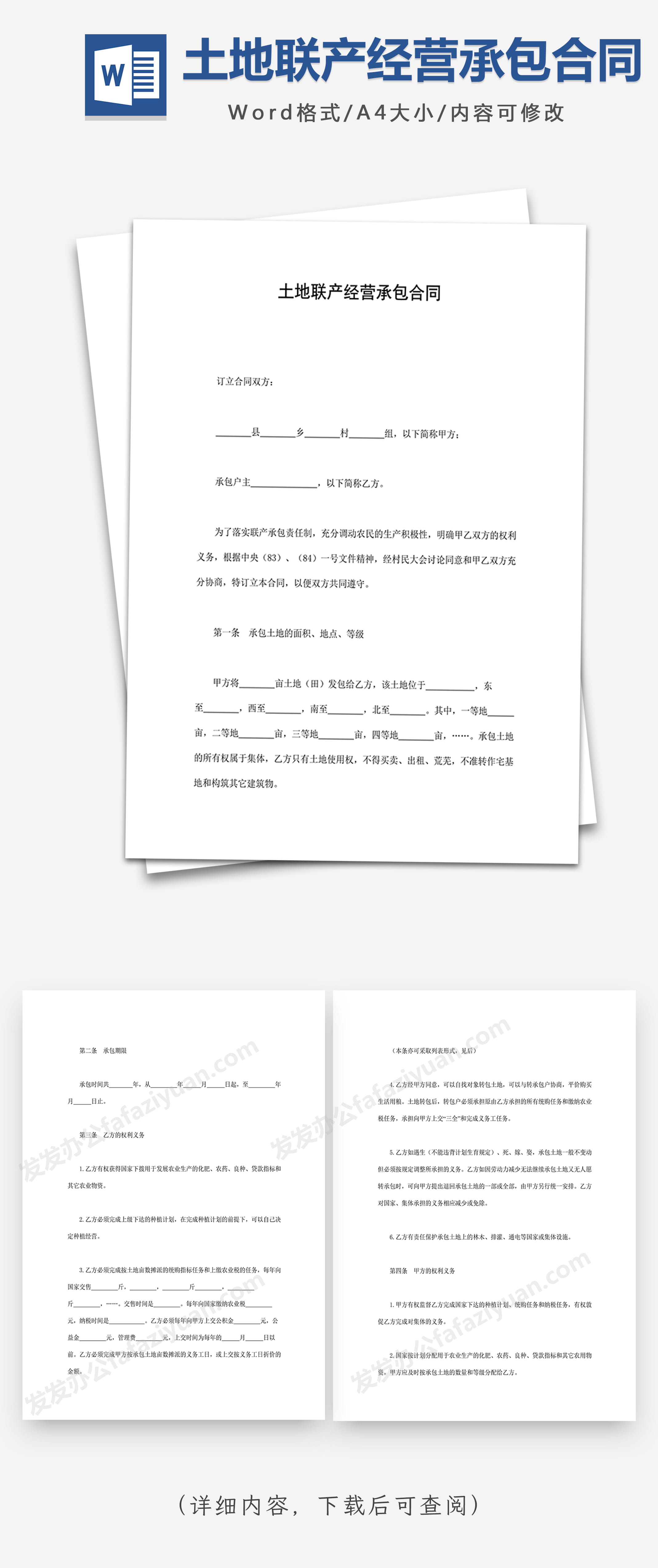 本作品内容为土地联产经营承包合同, 格式为 docx, 大小1 MB, 页数为6, 请使用软件Word打开, 作品中主体文字及图片可替换修改,文字修改可直接点击文本框进行编辑,图片更改可选中图片后单击鼠标右键选择更换图片,也可根据自身需求增加和删除作品中的内容, 源文件无水印, 欢迎使用发发资源库。