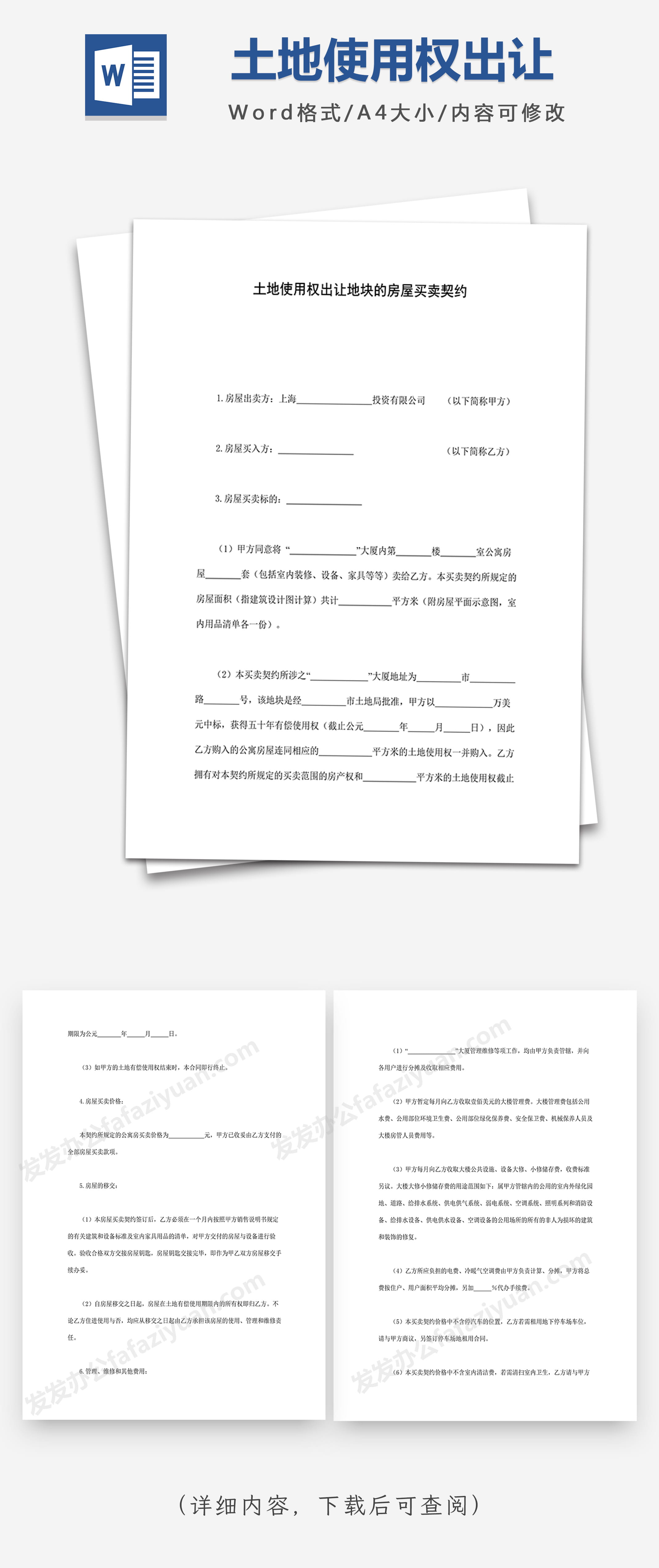 本作品内容为土地使用权出让地块的房屋买卖契约, 格式为 docx, 大小1 MB, 页数为6, 请使用软件Word打开, 作品中主体文字及图片可替换修改,文字修改可直接点击文本框进行编辑,图片更改可选中图片后单击鼠标右键选择更换图片,也可根据自身需求增加和删除作品中的内容, 源文件无水印, 欢迎使用发发资源库。 资源下载此资源下载价格为8.8F币,VIP免费,请先登录