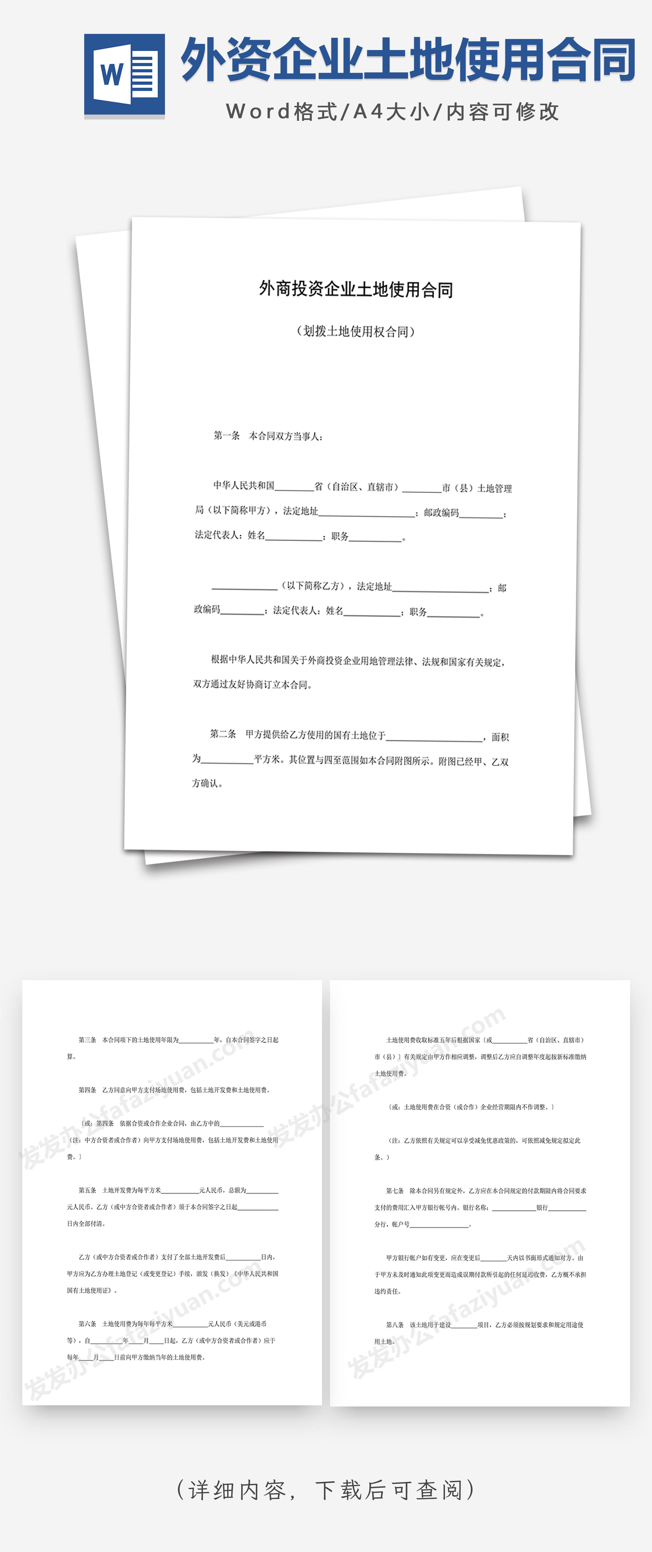 本作品内容为外商投资企业土地使用合同(划拨土地使用权合同), 格式为 docx, 大小1 MB, 页数为6, 请使用软件Word打开, 作品中主体文字及图片可替换修改,文字修改可直接点击文本框进行编辑,图片更改可选中图片后单击鼠标右键选择更换图片,也可根据自身需求增加和删除作品中的内容, 源文件无水印, 欢迎使用发发资源库。