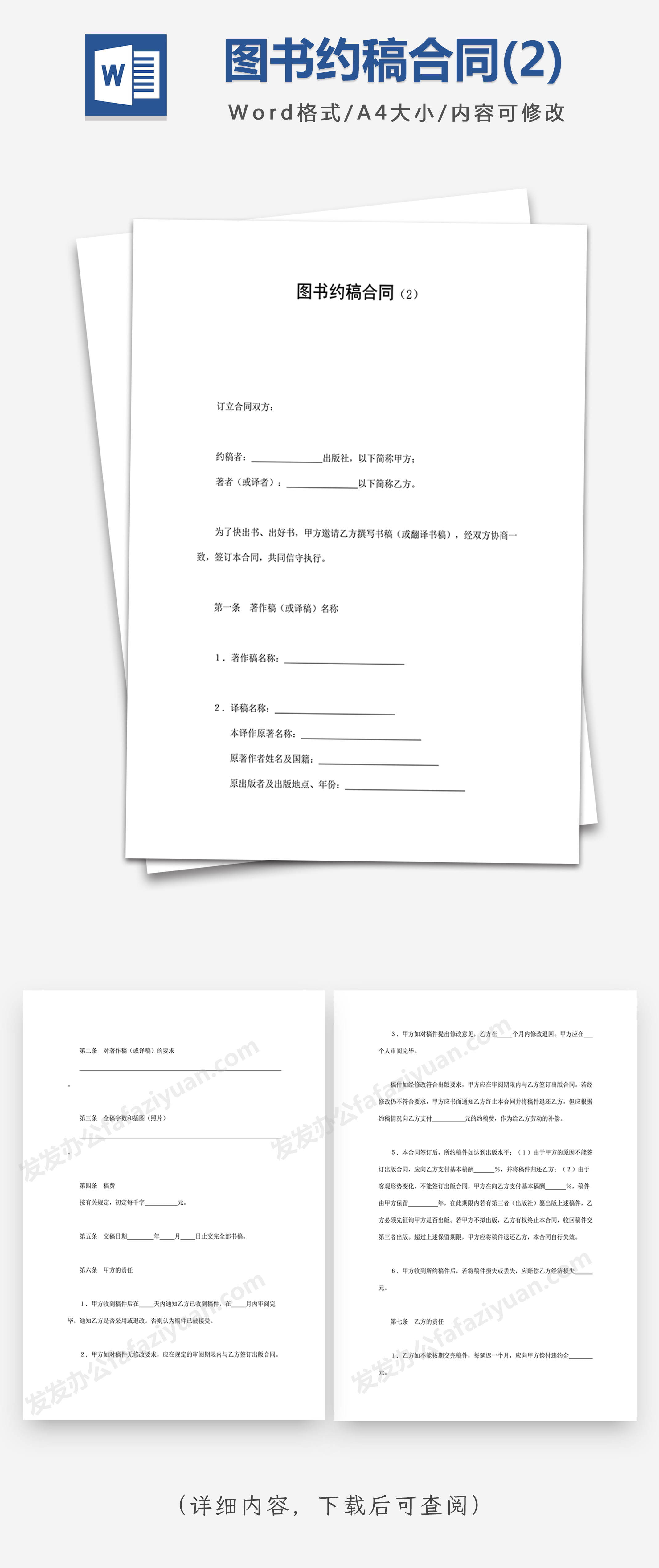 本作品内容为图书约稿合同(2), 格式为 docx, 大小1 MB, 页数为4, 请使用软件Word打开, 作品中主体文字及图片可替换修改,文字修改可直接点击文本框进行编辑,图片更改可选中图片后单击鼠标右键选择更换图片,也可根据自身需求增加和删除作品中的内容, 源文件无水印, 欢迎使用发发资源库。 资源下载此资源下载价格为8.8F币,VIP免费,请先登录