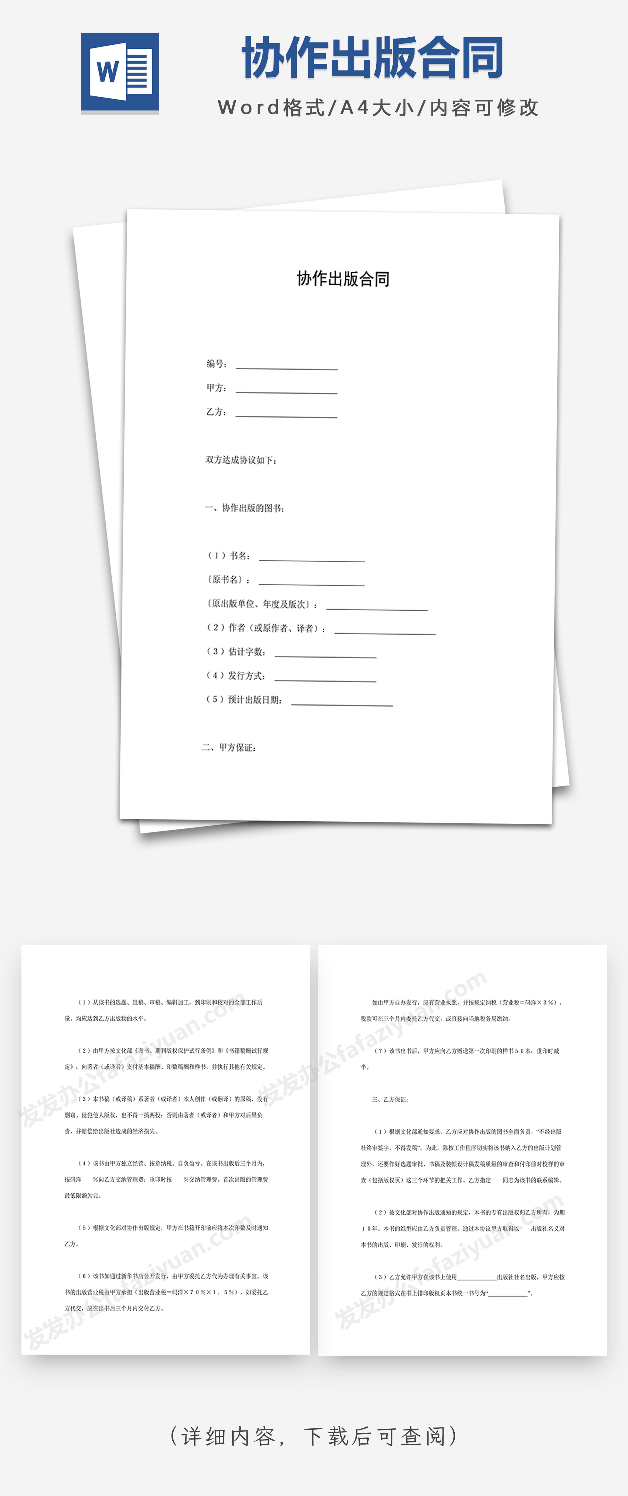 本作品内容为协作出版合同, 格式为 docx, 大小1 MB, 页数为5, 请使用软件Word打开, 作品中主体文字及图片可替换修改,文字修改可直接点击文本框进行编辑,图片更改可选中图片后单击鼠标右键选择更换图片,也可根据自身需求增加和删除作品中的内容, 源文件无水印, 欢迎使用发发资源库。