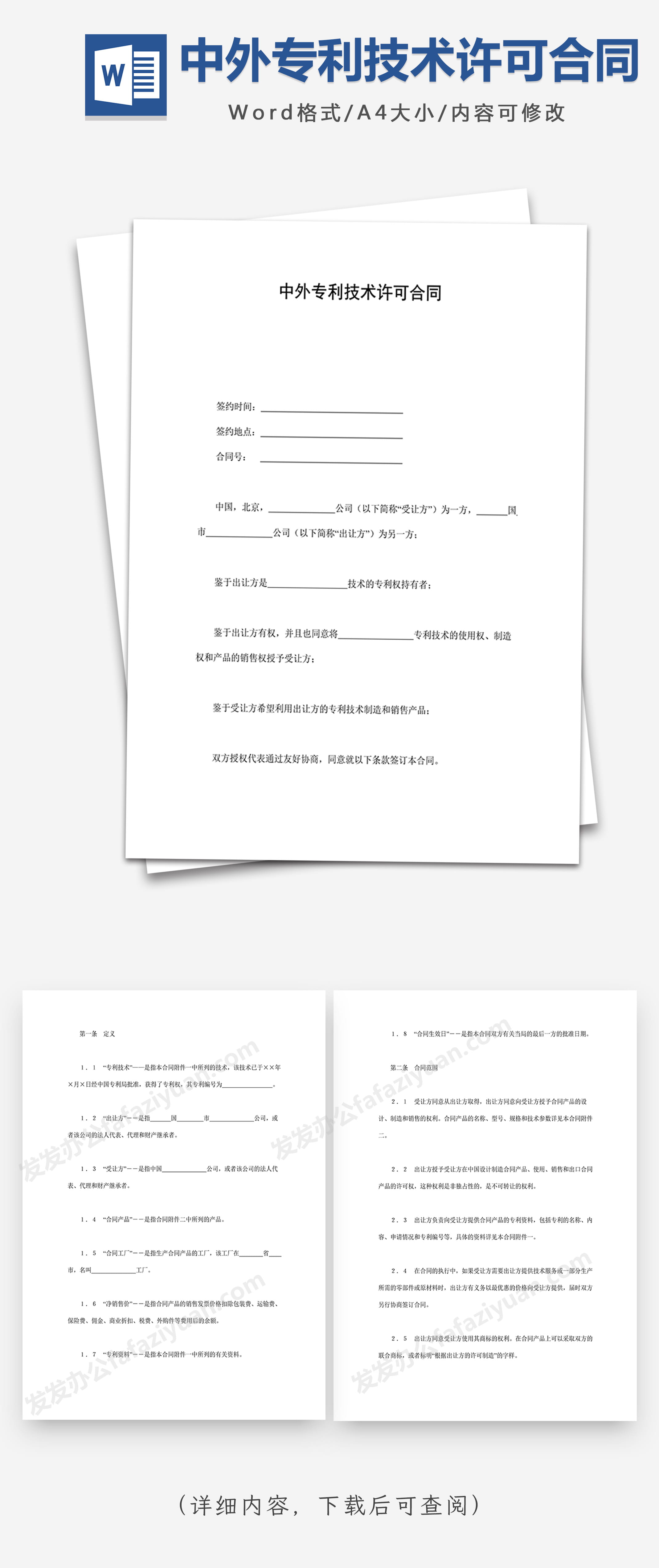 本作品内容为中外专利技术许可合同, 格式为 docx, 大小1 MB, 页数为10, 请使用软件Word打开, 作品中主体文字及图片可替换修改,文字修改可直接点击文本框进行编辑,图片更改可选中图片后单击鼠标右键选择更换图片,也可根据自身需求增加和删除作品中的内容, 源文件无水印, 欢迎使用发发资源库。