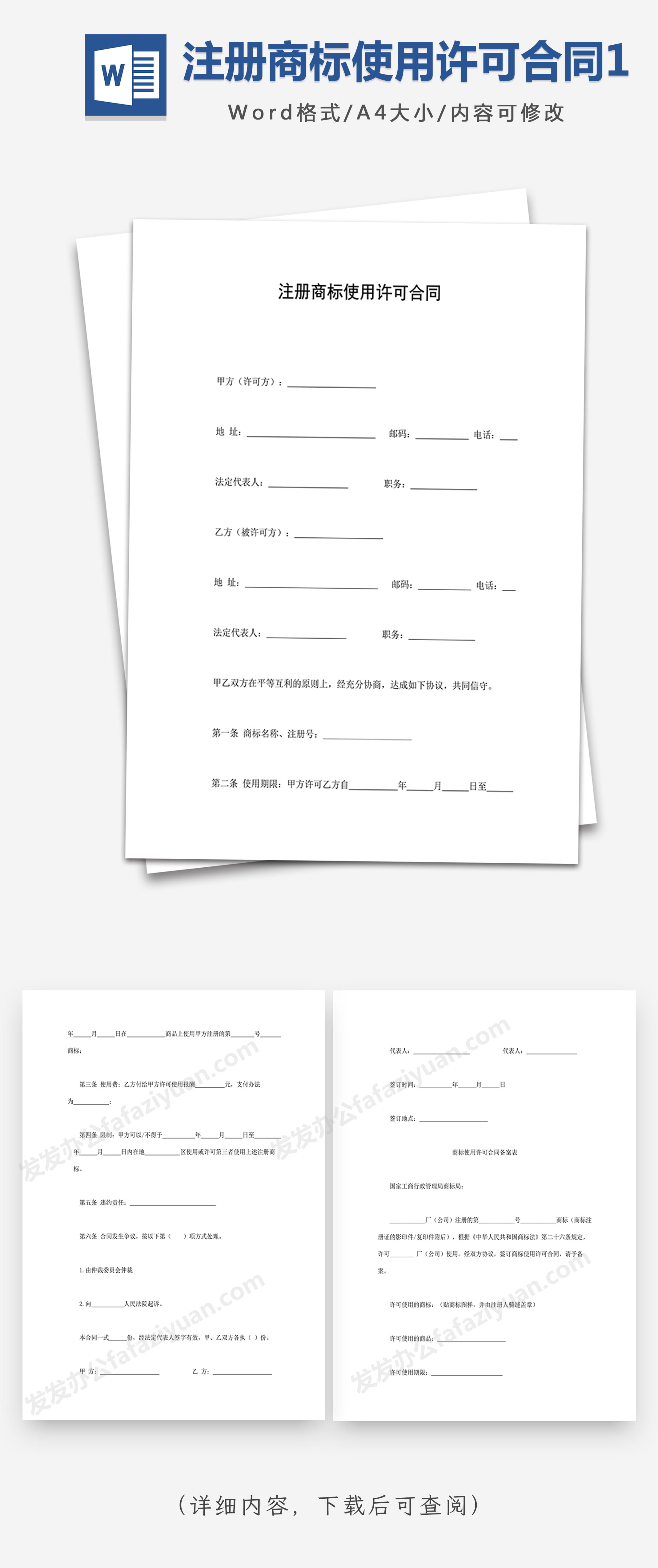 本作品内容为注册商标使用许可合同1, 格式为 docx, 大小1 MB, 页数为4, 请使用软件Word打开, 作品中主体文字及图片可替换修改,文字修改可直接点击文本框进行编辑,图片更改可选中图片后单击鼠标右键选择更换图片,也可根据自身需求增加和删除作品中的内容, 源文件无水印, 欢迎使用发发资源库。