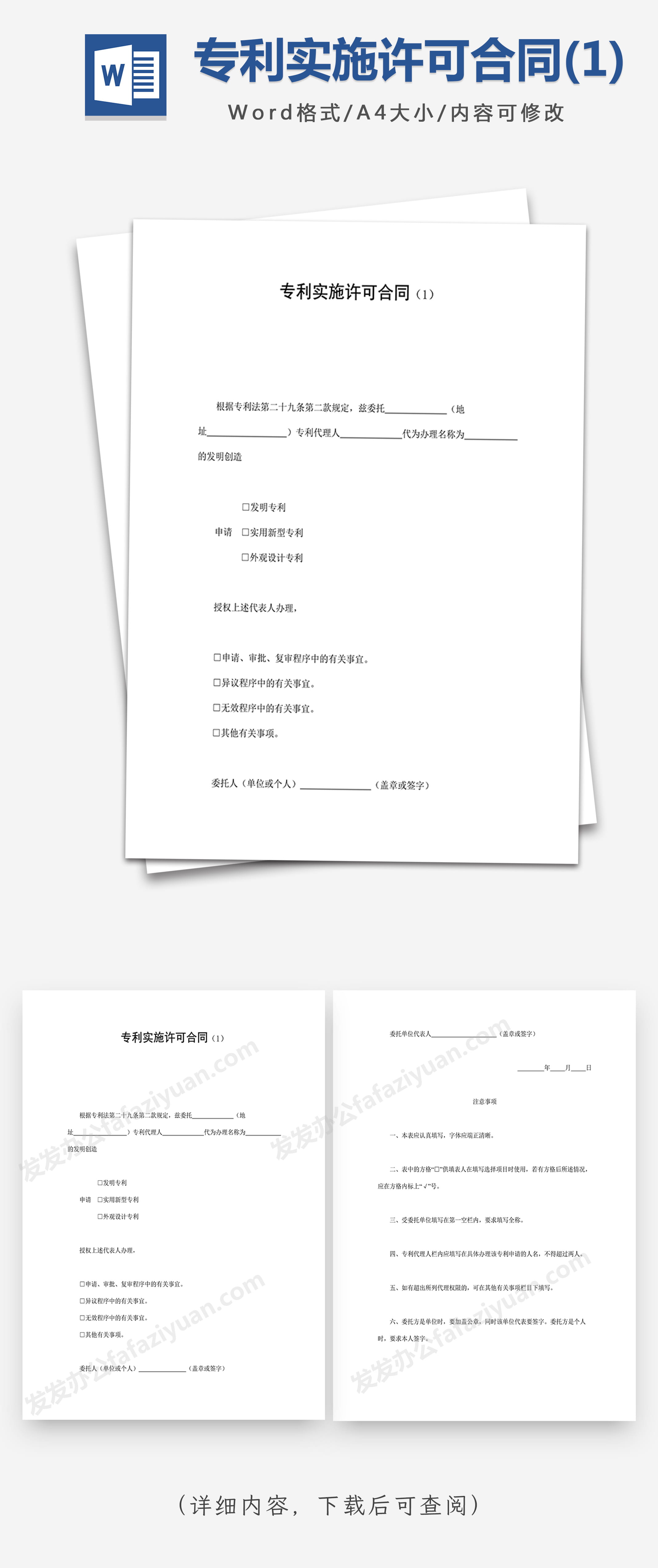 本作品内容为专利实施许可合同(1), 格式为 docx, 大小1 MB, 页数为2, 请使用软件Word打开, 作品中主体文字及图片可替换修改,文字修改可直接点击文本框进行编辑,图片更改可选中图片后单击鼠标右键选择更换图片,也可根据自身需求增加和删除作品中的内容, 源文件无水印, 欢迎使用发发资源库。