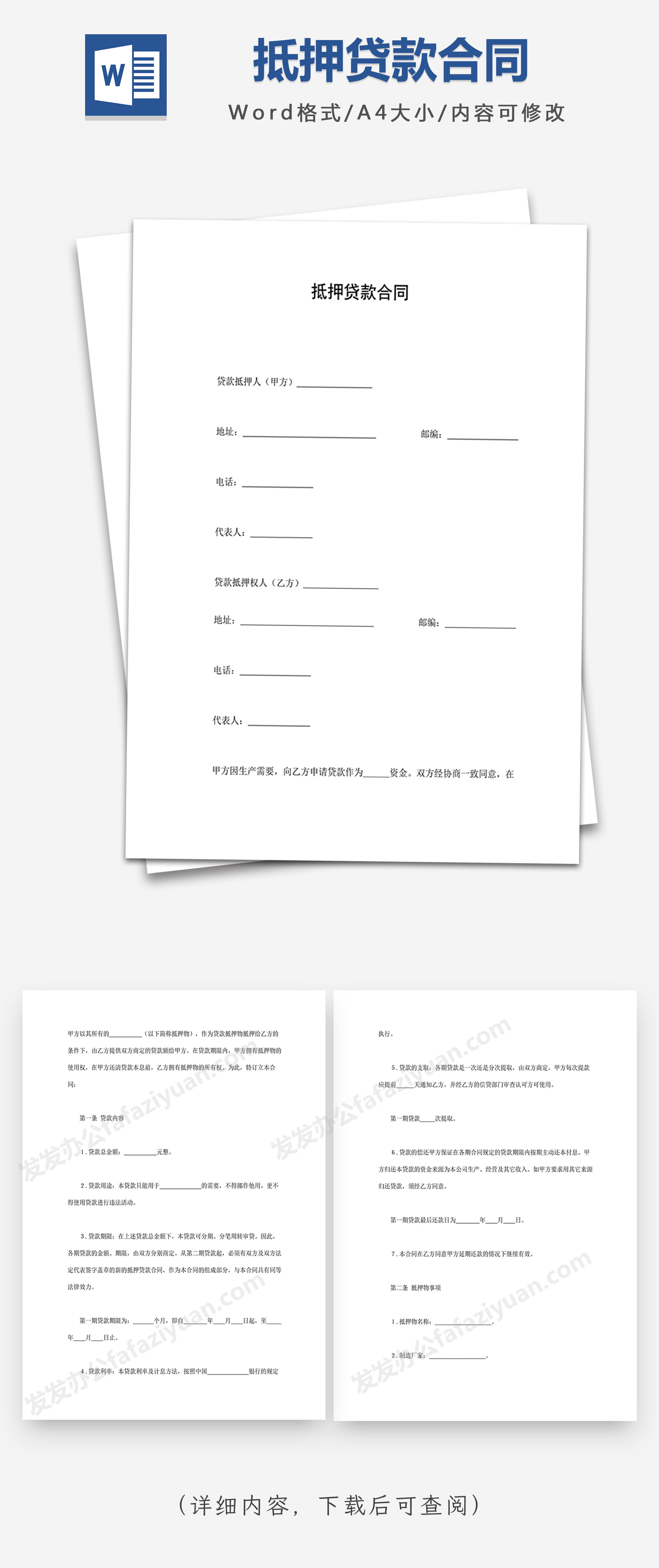 本作品内容为抵押贷款合同, 格式为 docx, 大小1 MB, 页数为8, 请使用软件Word打开, 作品中主体文字及图片可替换修改,文字修改可直接点击文本框进行编辑,图片更改可选中图片后单击鼠标右键选择更换图片,也可根据自身需求增加和删除作品中的内容, 源文件无水印, 欢迎使用发发资源库。 资源下载此资源下载价格为8.8F币,VIP免费,请先登录