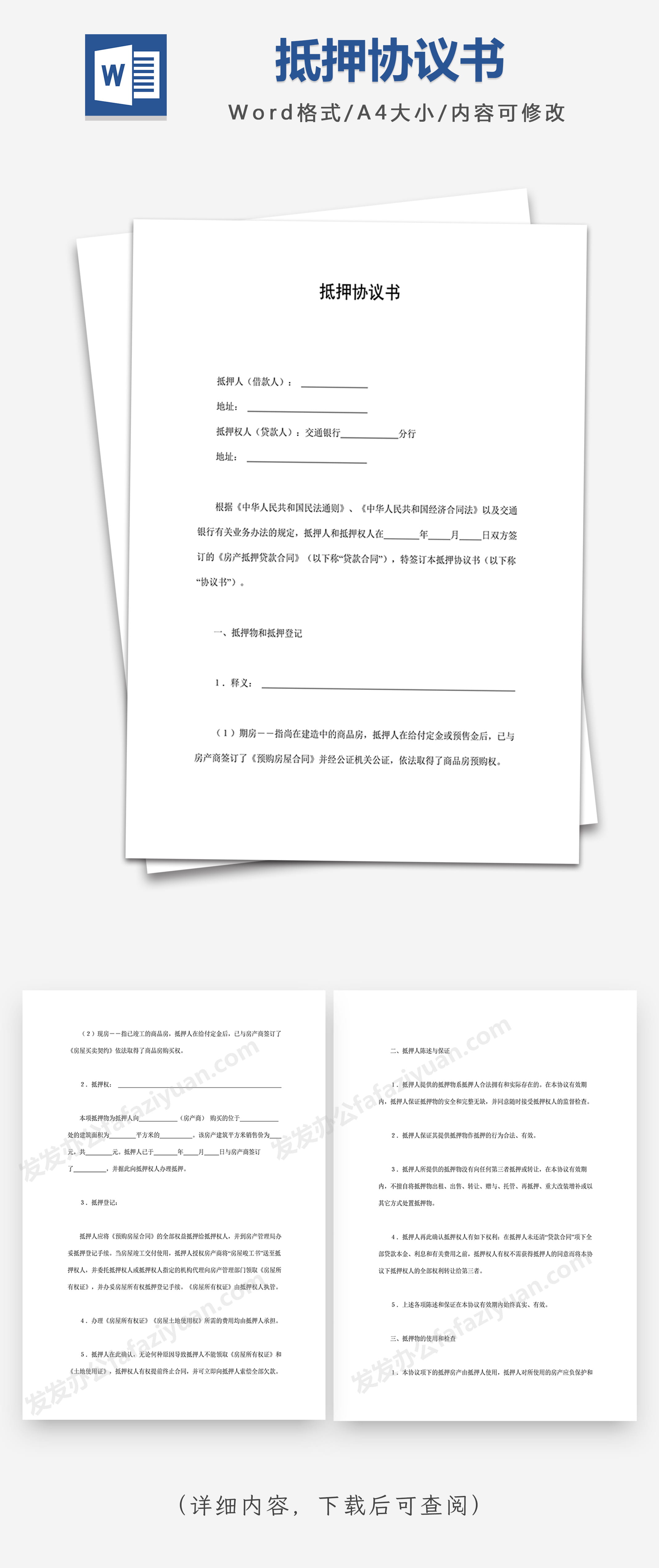 本作品内容为抵押协议书, 格式为 docx, 大小1 MB, 页数为6, 请使用软件Word打开, 作品中主体文字及图片可替换修改,文字修改可直接点击文本框进行编辑,图片更改可选中图片后单击鼠标右键选择更换图片,也可根据自身需求增加和删除作品中的内容, 源文件无水印, 欢迎使用发发资源库。