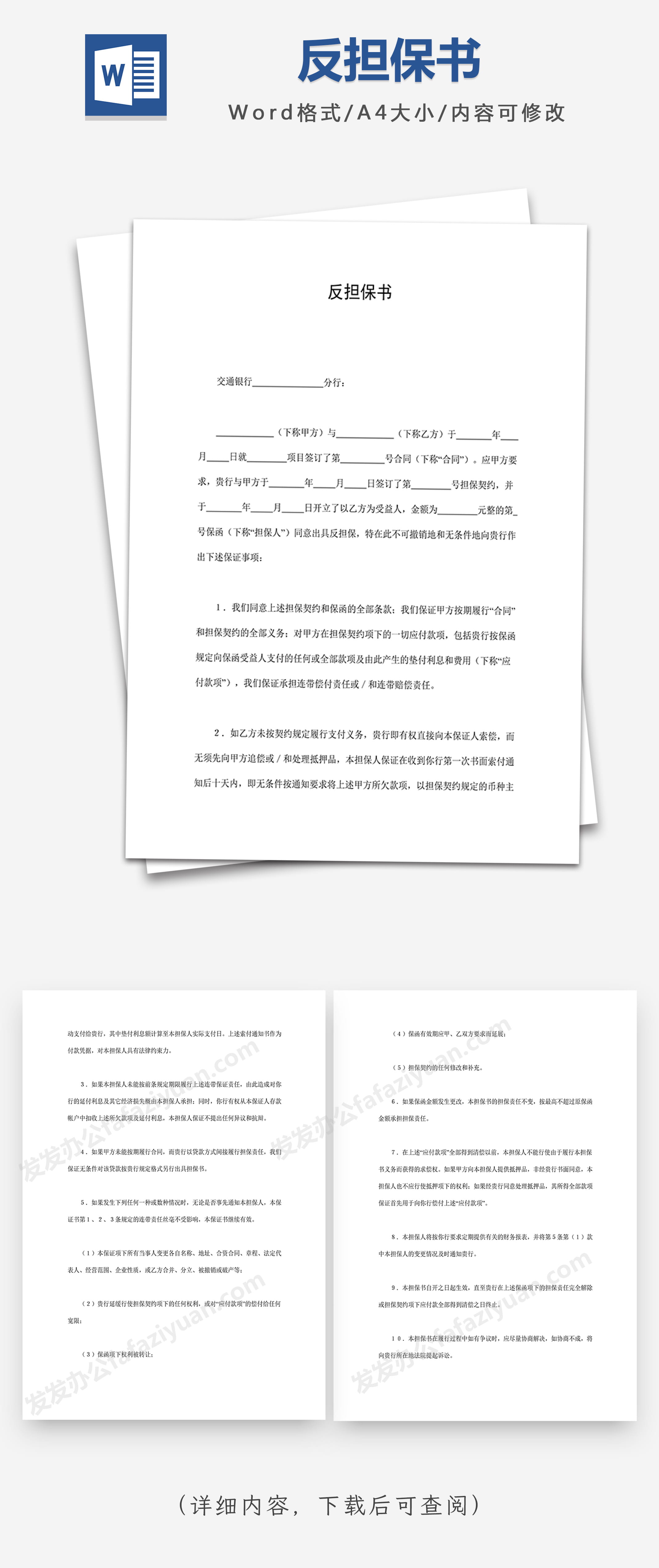 本作品内容为反担保书, 格式为 docx, 大小1 MB, 页数为4, 请使用软件Word打开, 作品中主体文字及图片可替换修改,文字修改可直接点击文本框进行编辑,图片更改可选中图片后单击鼠标右键选择更换图片,也可根据自身需求增加和删除作品中的内容, 源文件无水印, 欢迎使用发发资源库。