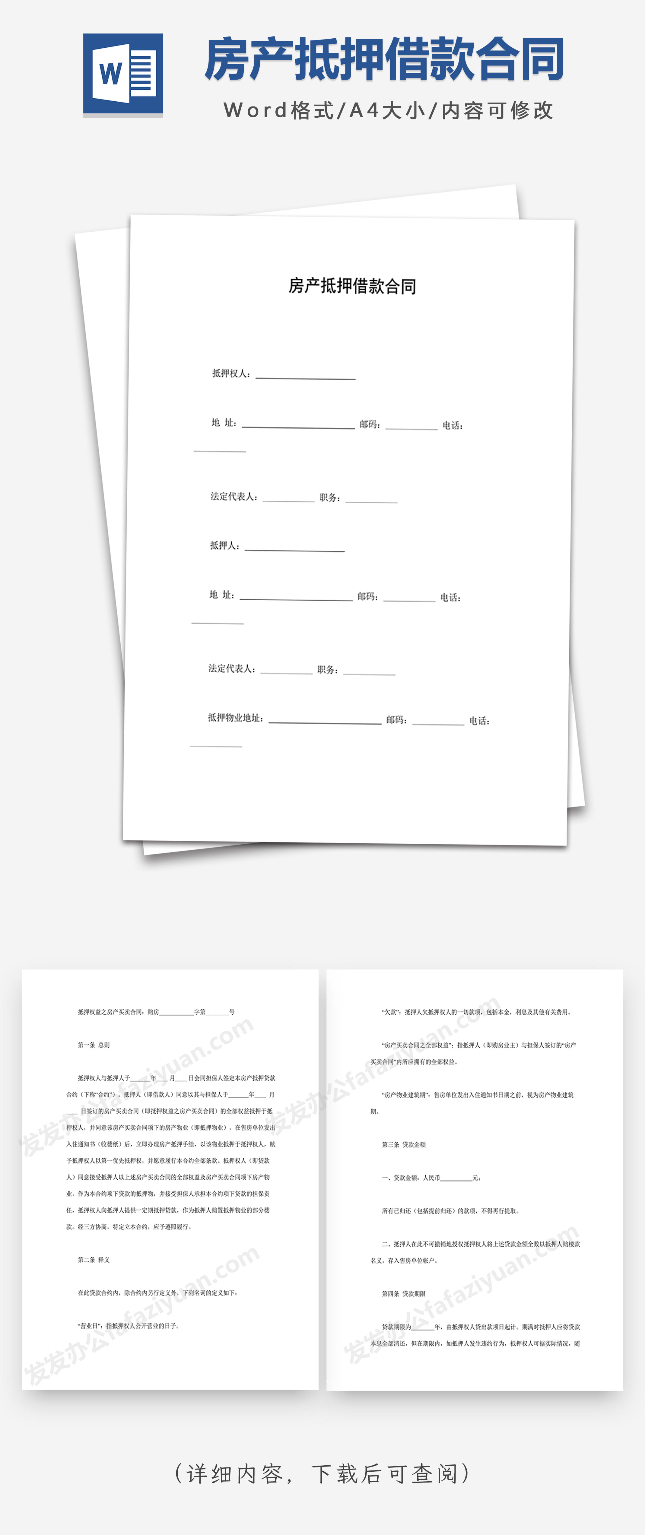 本作品内容为房产抵押借款合同, 格式为 docx, 大小1 MB, 页数为26, 请使用软件Word打开, 作品中主体文字及图片可替换修改,文字修改可直接点击文本框进行编辑,图片更改可选中图片后单击鼠标右键选择更换图片,也可根据自身需求增加和删除作品中的内容, 源文件无水印, 欢迎使用发发资源库。