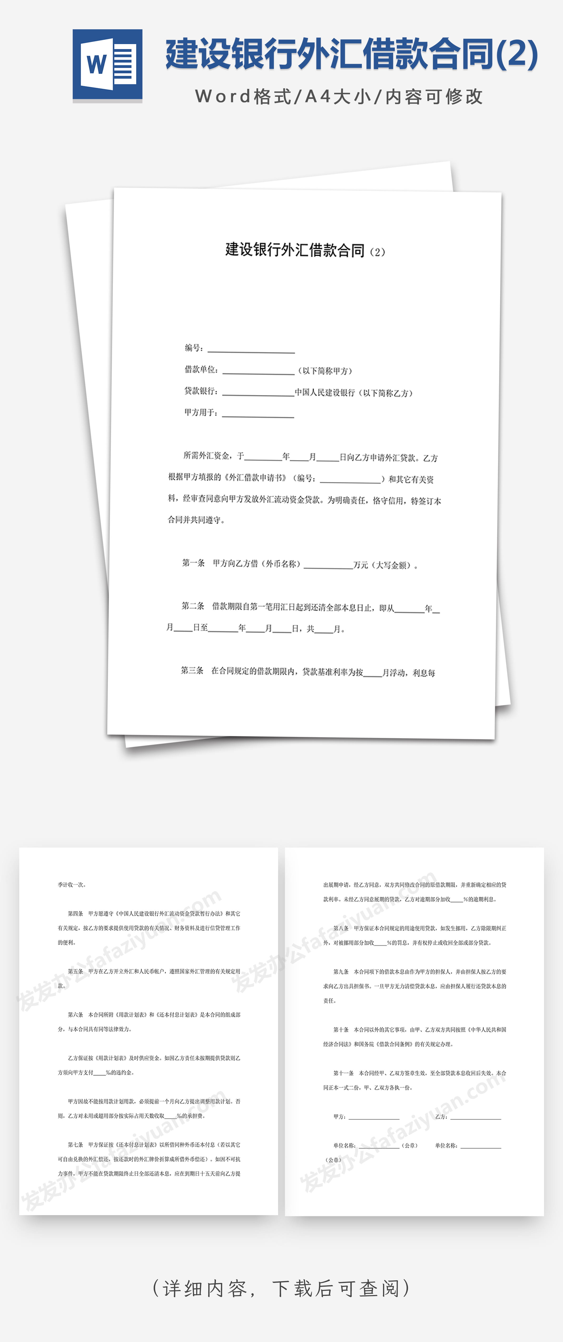 本作品内容为建设银行外汇借款合同(2), 格式为 docx, 大小1 MB, 页数为4, 请使用软件Word打开, 作品中主体文字及图片可替换修改,文字修改可直接点击文本框进行编辑,图片更改可选中图片后单击鼠标右键选择更换图片,也可根据自身需求增加和删除作品中的内容, 源文件无水印, 欢迎使用发发资源库。