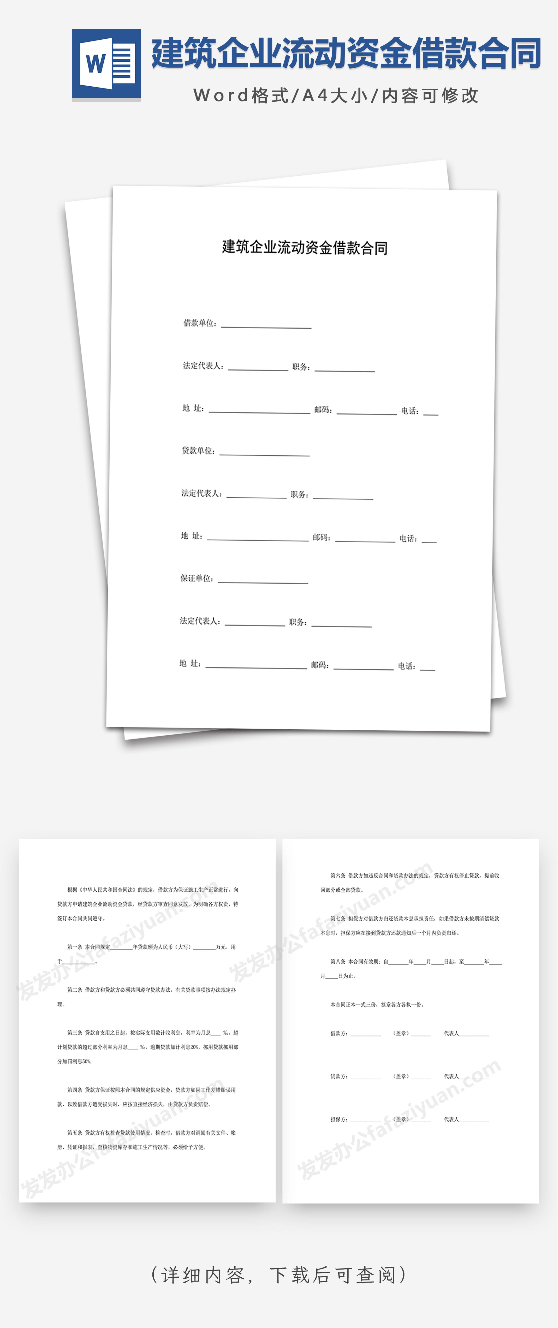 本作品内容为建筑企业流动资金借款合同, 格式为 docx, 大小1 MB, 页数为4, 请使用软件Word打开, 作品中主体文字及图片可替换修改,文字修改可直接点击文本框进行编辑,图片更改可选中图片后单击鼠标右键选择更换图片,也可根据自身需求增加和删除作品中的内容, 源文件无水印, 欢迎使用发发资源库。