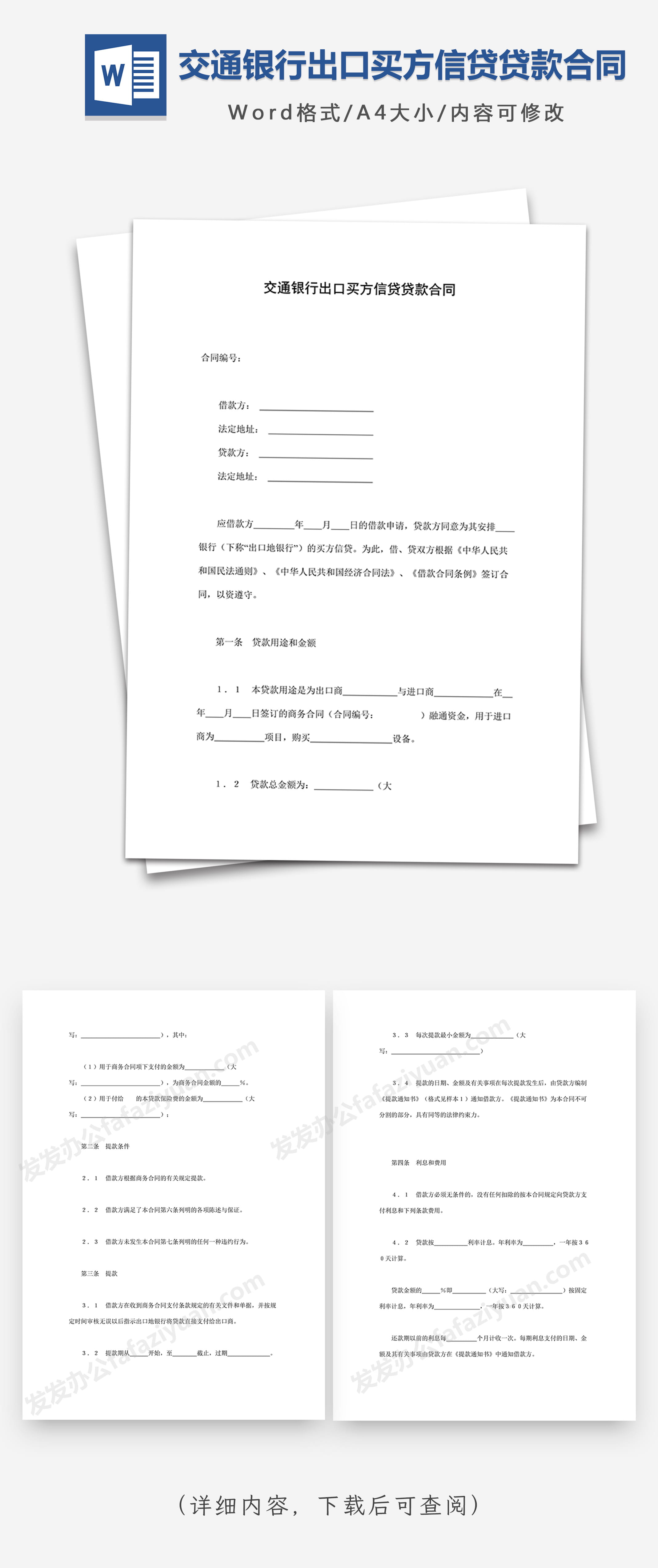 本作品内容为交通银行出口买方信贷贷款合同, 格式为 docx, 大小1 MB, 页数为12, 请使用软件Word打开, 作品中主体文字及图片可替换修改,文字修改可直接点击文本框进行编辑,图片更改可选中图片后单击鼠标右键选择更换图片,也可根据自身需求增加和删除作品中的内容, 源文件无水印, 欢迎使用发发资源库。