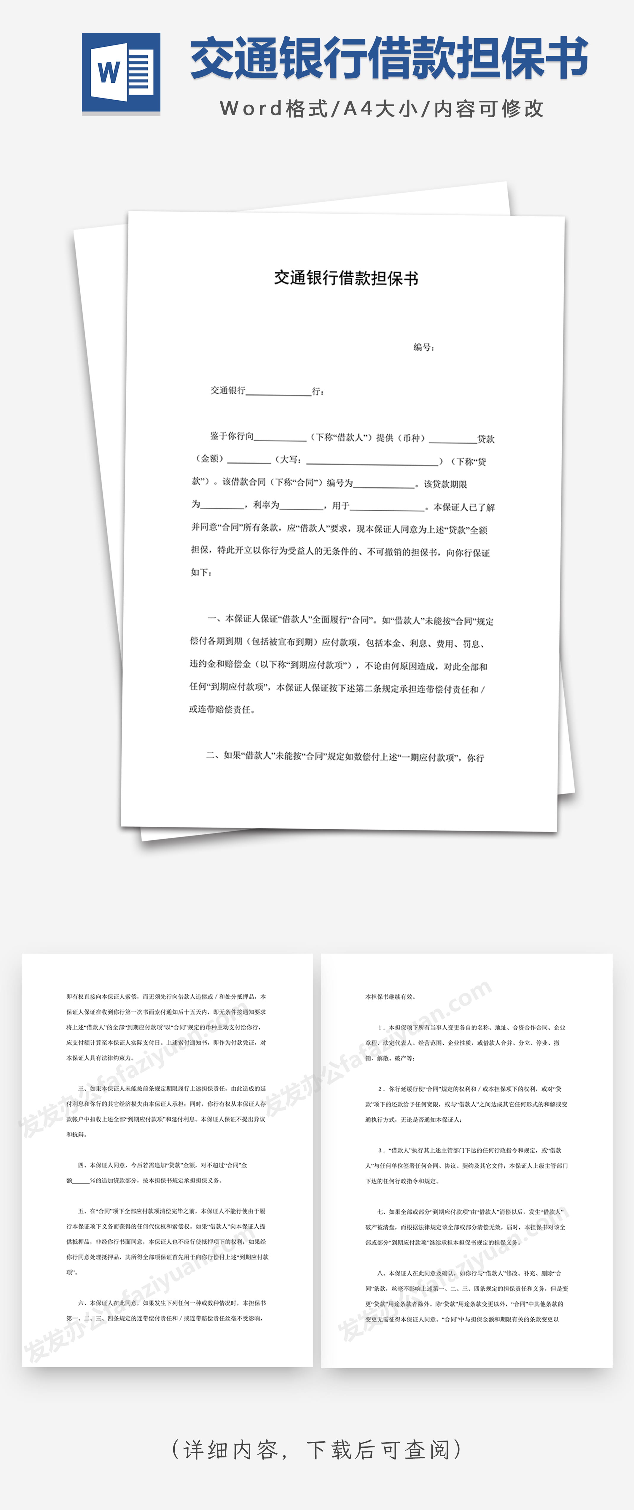 本作品内容为交通银行借款担保书, 格式为 docx, 大小1 MB, 页数为5, 请使用软件Word打开, 作品中主体文字及图片可替换修改,文字修改可直接点击文本框进行编辑,图片更改可选中图片后单击鼠标右键选择更换图片,也可根据自身需求增加和删除作品中的内容, 源文件无水印, 欢迎使用发发资源库。
