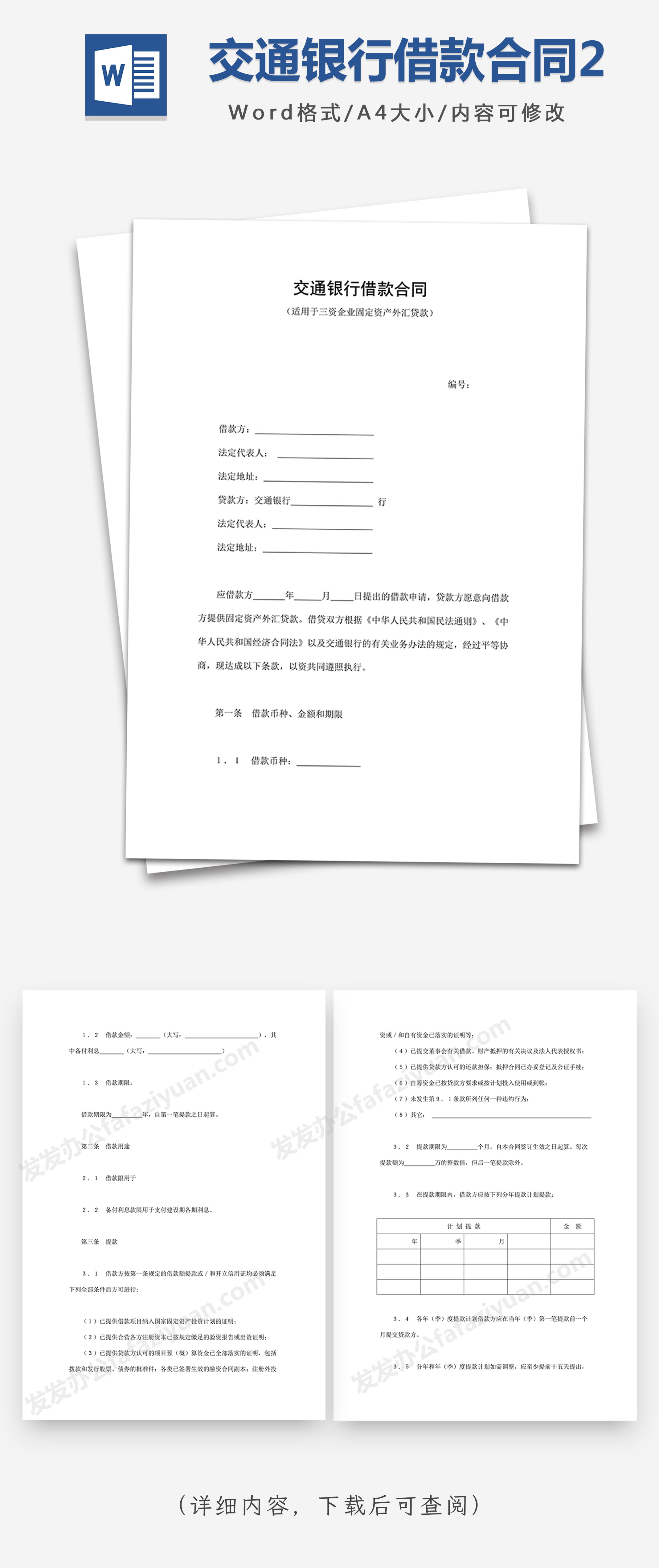 本作品内容为交通银行借款合同2, 格式为 docx, 大小1 MB, 页数为14, 请使用软件Word打开, 作品中主体文字及图片可替换修改,文字修改可直接点击文本框进行编辑,图片更改可选中图片后单击鼠标右键选择更换图片,也可根据自身需求增加和删除作品中的内容, 源文件无水印, 欢迎使用发发资源库。