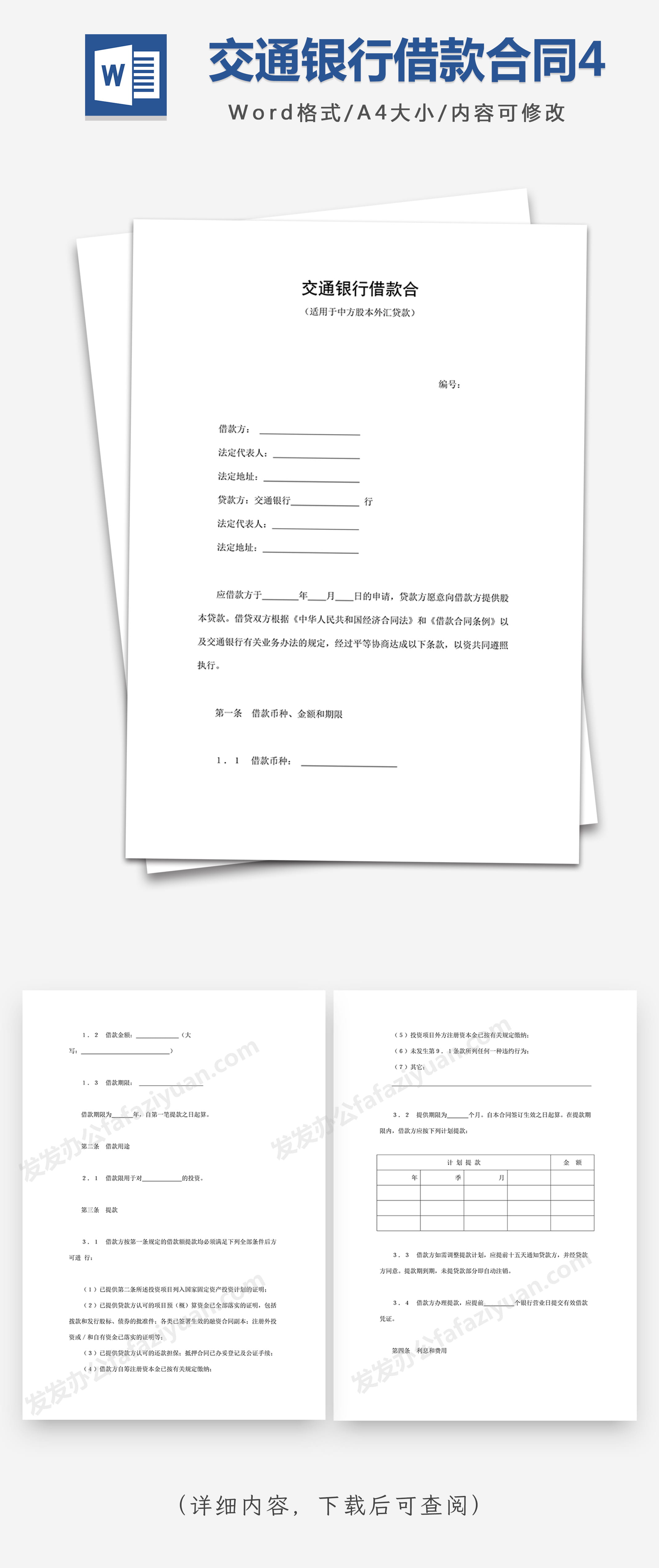 本作品内容为交通银行借款合同4, 格式为 docx, 大小1 MB, 页数为12, 请使用软件Word打开, 作品中主体文字及图片可替换修改,文字修改可直接点击文本框进行编辑,图片更改可选中图片后单击鼠标右键选择更换图片,也可根据自身需求增加和删除作品中的内容, 源文件无水印, 欢迎使用发发资源库。