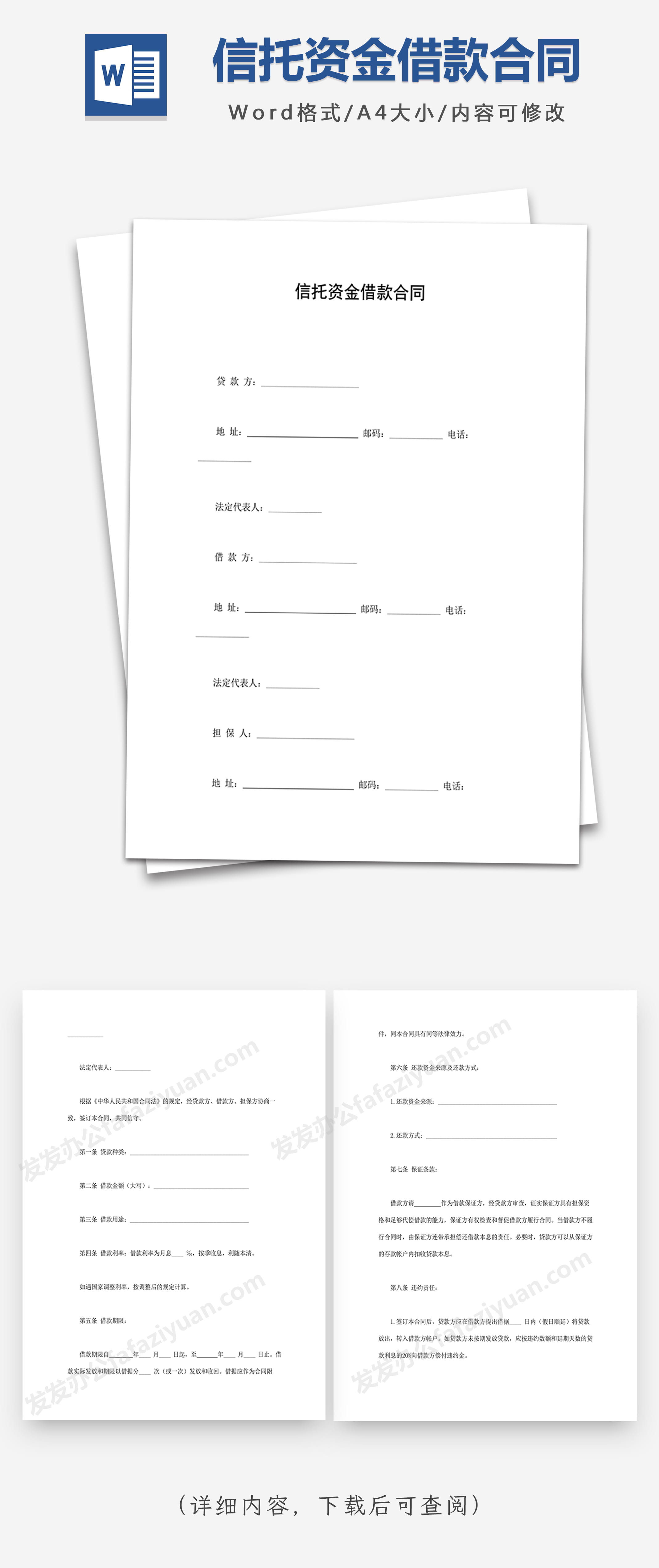 本作品内容为信托资金借款合同, 格式为 docx, 大小1 MB, 页数为6, 请使用软件Word打开, 作品中主体文字及图片可替换修改,文字修改可直接点击文本框进行编辑,图片更改可选中图片后单击鼠标右键选择更换图片,也可根据自身需求增加和删除作品中的内容, 源文件无水印, 欢迎使用发发资源库。