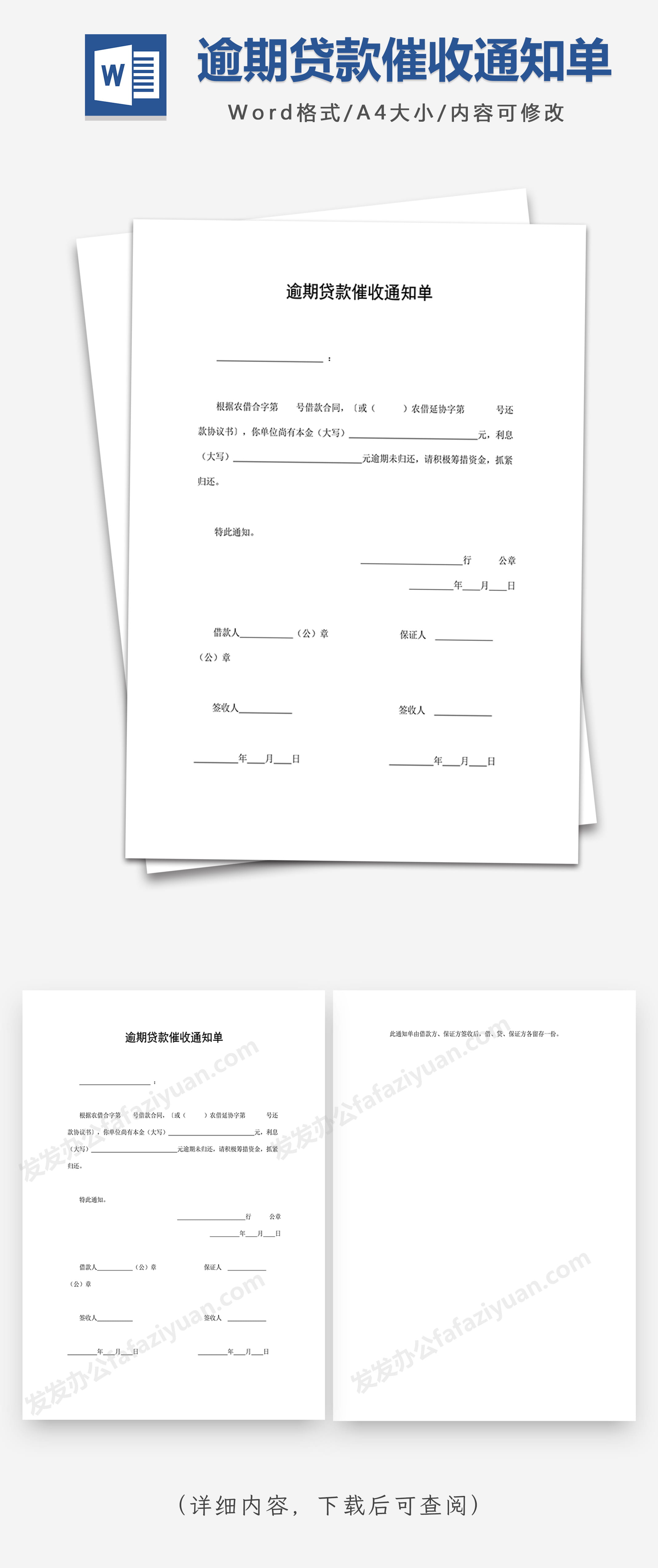 本作品内容为逾期贷款催收通知单, 格式为 docx, 大小1 MB, 页数为2, 请使用软件Word打开, 作品中主体文字及图片可替换修改,文字修改可直接点击文本框进行编辑,图片更改可选中图片后单击鼠标右键选择更换图片,也可根据自身需求增加和删除作品中的内容, 源文件无水印, 欢迎使用发发资源库。