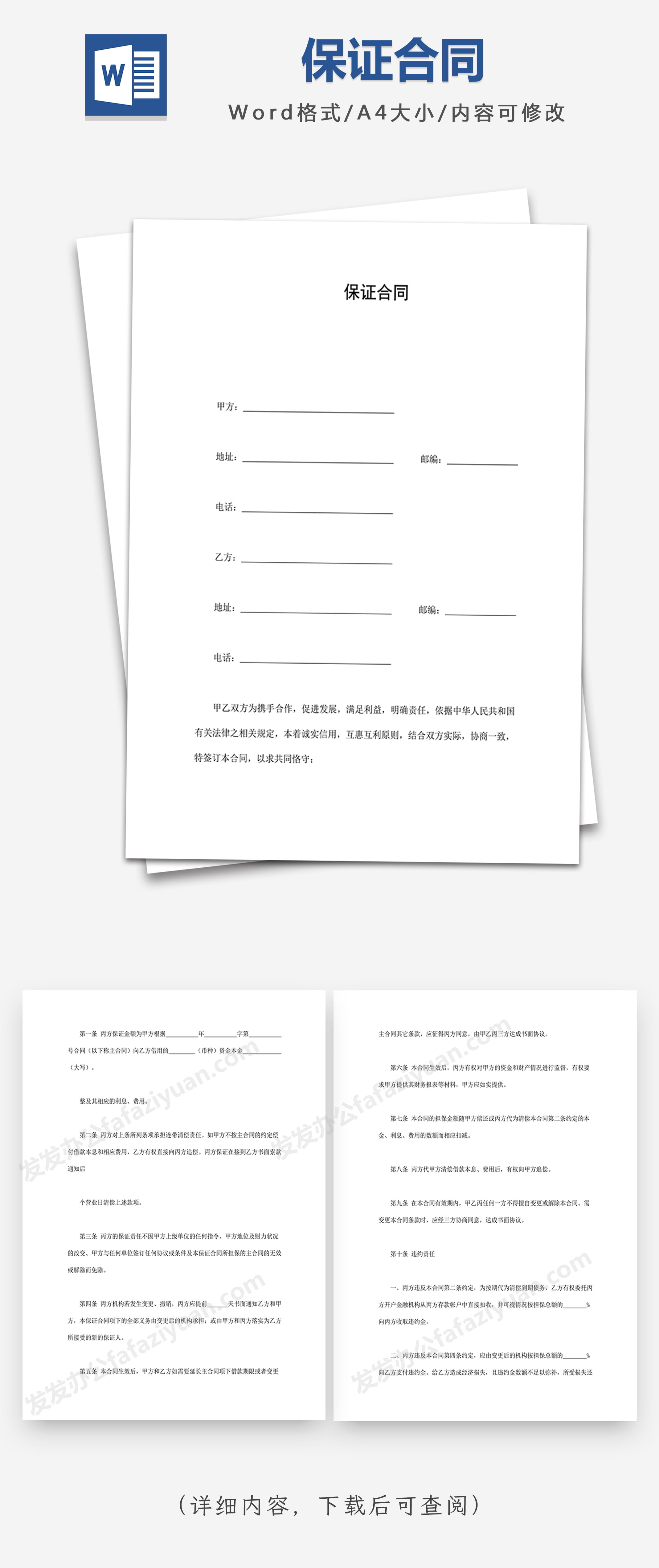 本作品内容为保证合同, 格式为 docx, 大小1 MB, 页数为7, 请使用软件Word打开, 作品中主体文字及图片可替换修改,文字修改可直接点击文本框进行编辑,图片更改可选中图片后单击鼠标右键选择更换图片,也可根据自身需求增加和删除作品中的内容, 源文件无水印, 欢迎使用发发资源库。
