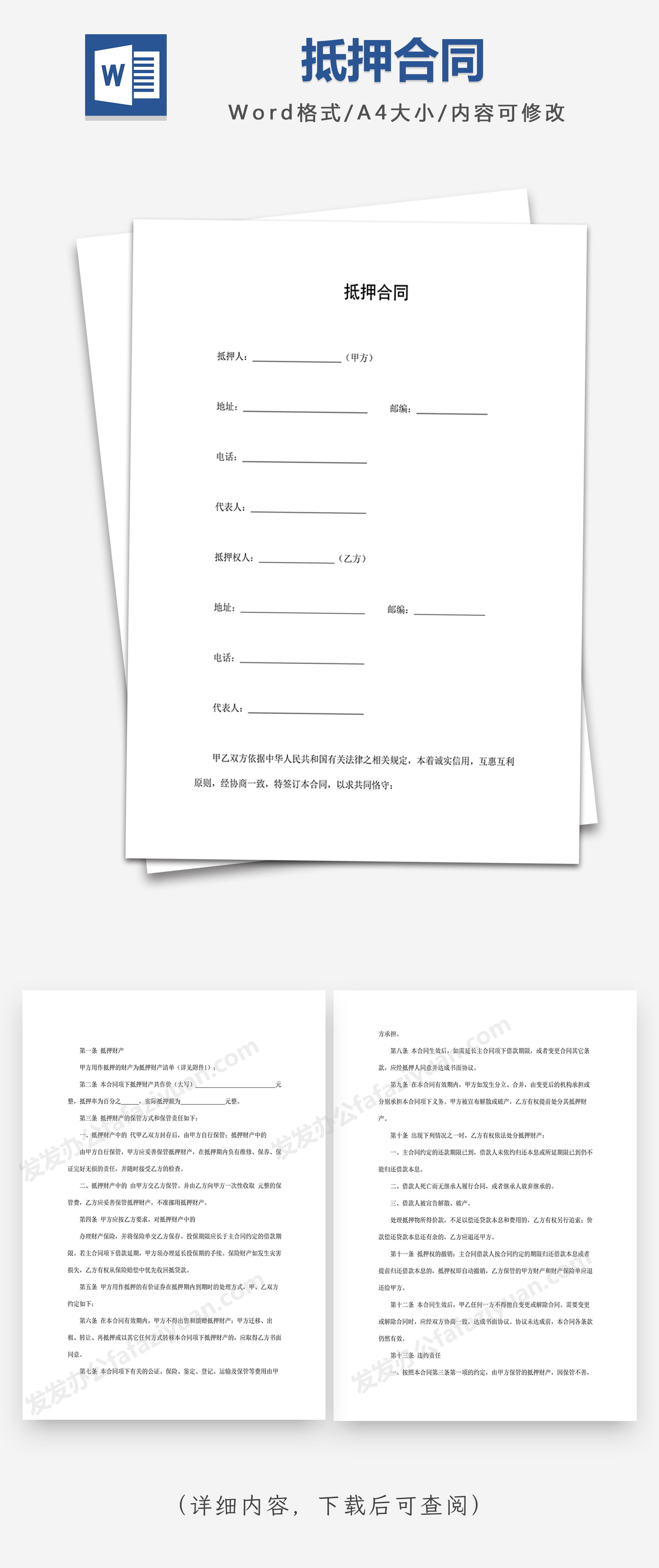 本作品内容为抵押合同, 格式为 docx, 大小1 MB, 页数为5, 请使用软件Word打开, 作品中主体文字及图片可替换修改,文字修改可直接点击文本框进行编辑,图片更改可选中图片后单击鼠标右键选择更换图片,也可根据自身需求增加和删除作品中的内容, 源文件无水印, 欢迎使用发发资源库。 资源下载此资源下载价格为8.8F币,VIP免费,请先登录