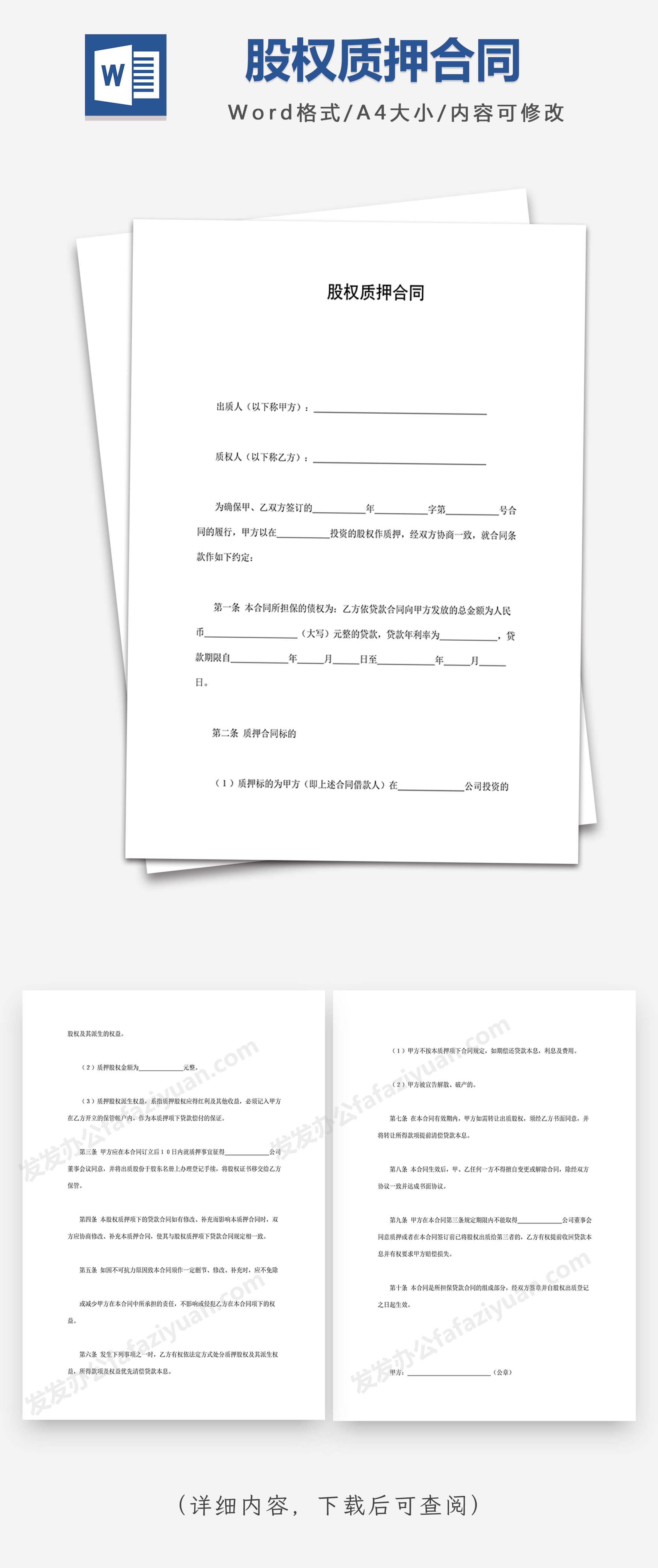 本作品内容为股权质押合同, 格式为 docx, 大小1 MB, 页数为4, 请使用软件Word打开, 作品中主体文字及图片可替换修改,文字修改可直接点击文本框进行编辑,图片更改可选中图片后单击鼠标右键选择更换图片,也可根据自身需求增加和删除作品中的内容, 源文件无水印, 欢迎使用发发资源库。