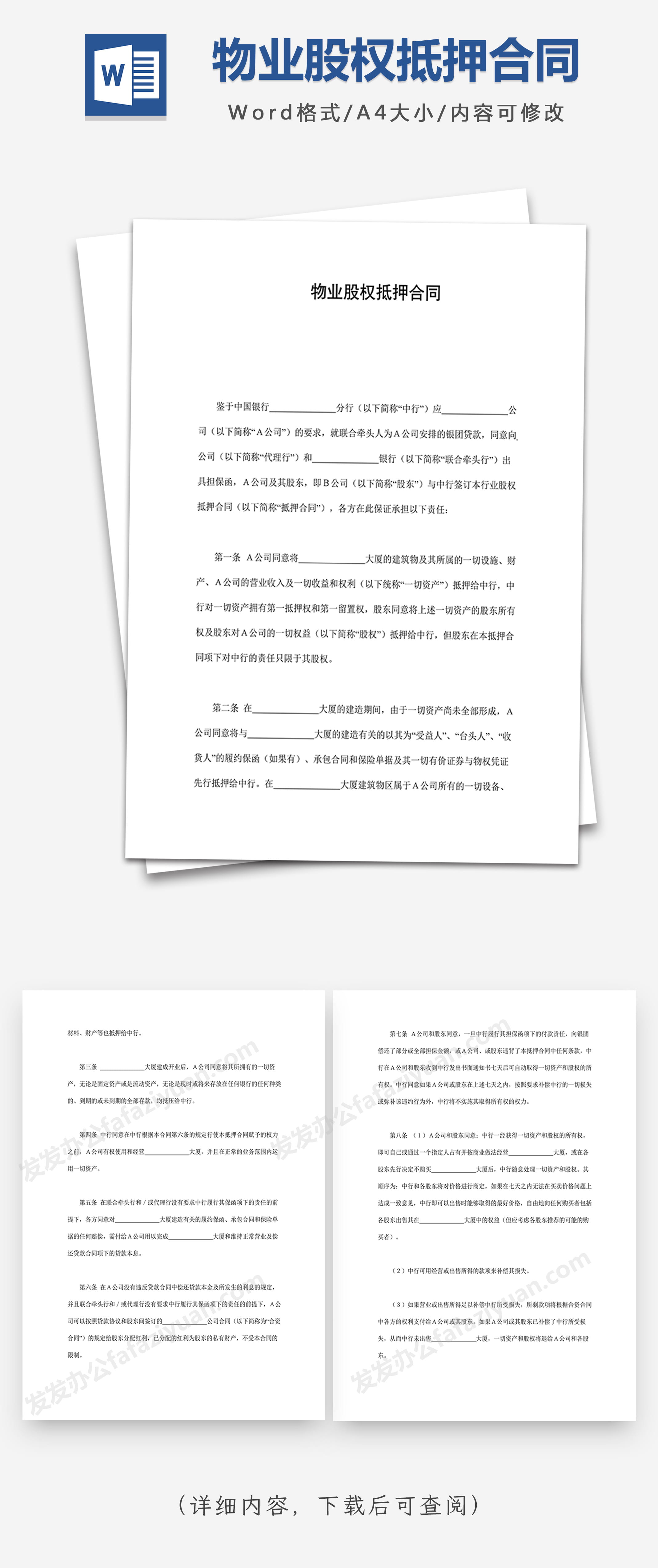本作品内容为物业股权抵押合同, 格式为 docx, 大小1 MB, 页数为8, 请使用软件Word打开, 作品中主体文字及图片可替换修改,文字修改可直接点击文本框进行编辑,图片更改可选中图片后单击鼠标右键选择更换图片,也可根据自身需求增加和删除作品中的内容, 源文件无水印, 欢迎使用发发资源库。