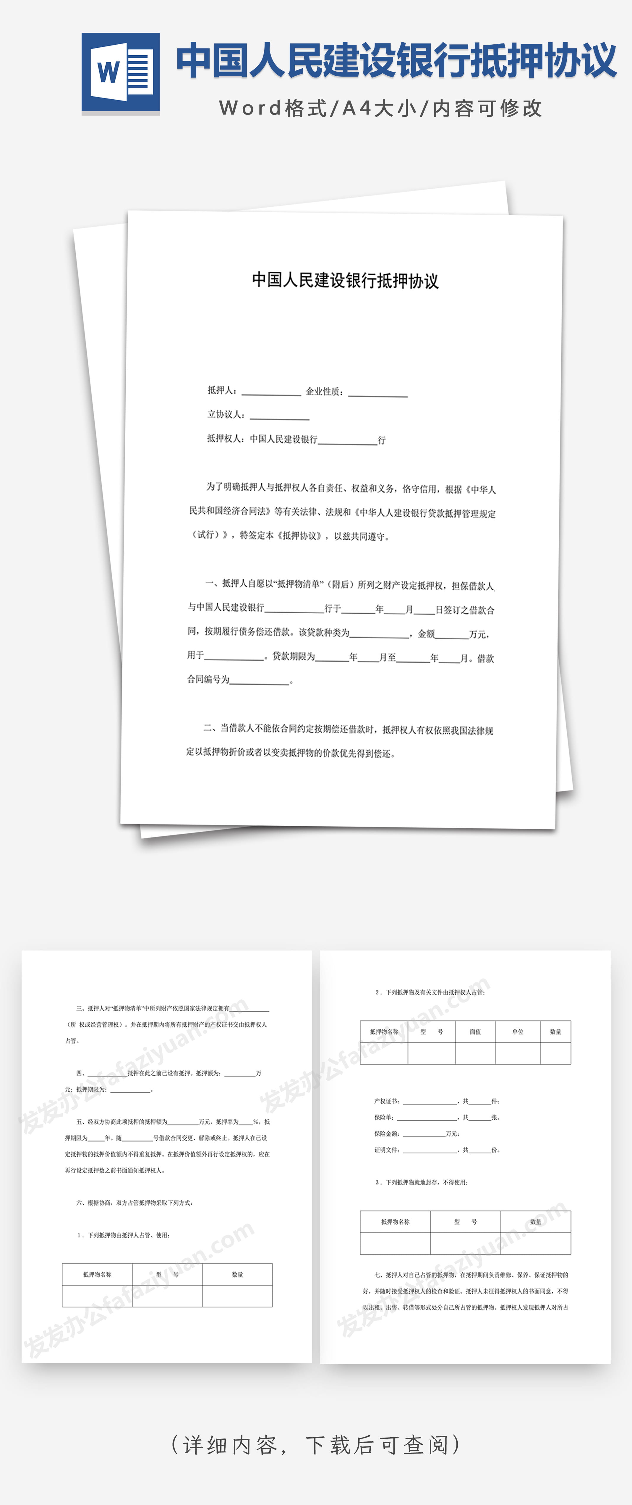 本作品内容为中国人民建设银行抵押协议, 格式为 docx, 大小1 MB, 页数为6, 请使用软件Word打开, 作品中主体文字及图片可替换修改,文字修改可直接点击文本框进行编辑,图片更改可选中图片后单击鼠标右键选择更换图片,也可根据自身需求增加和删除作品中的内容, 源文件无水印, 欢迎使用发发资源库。